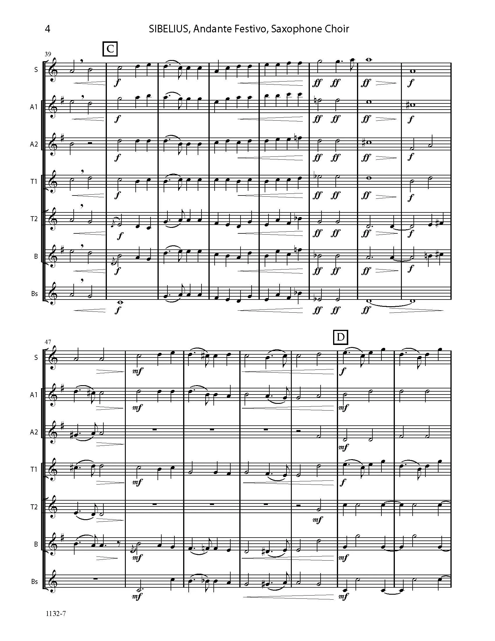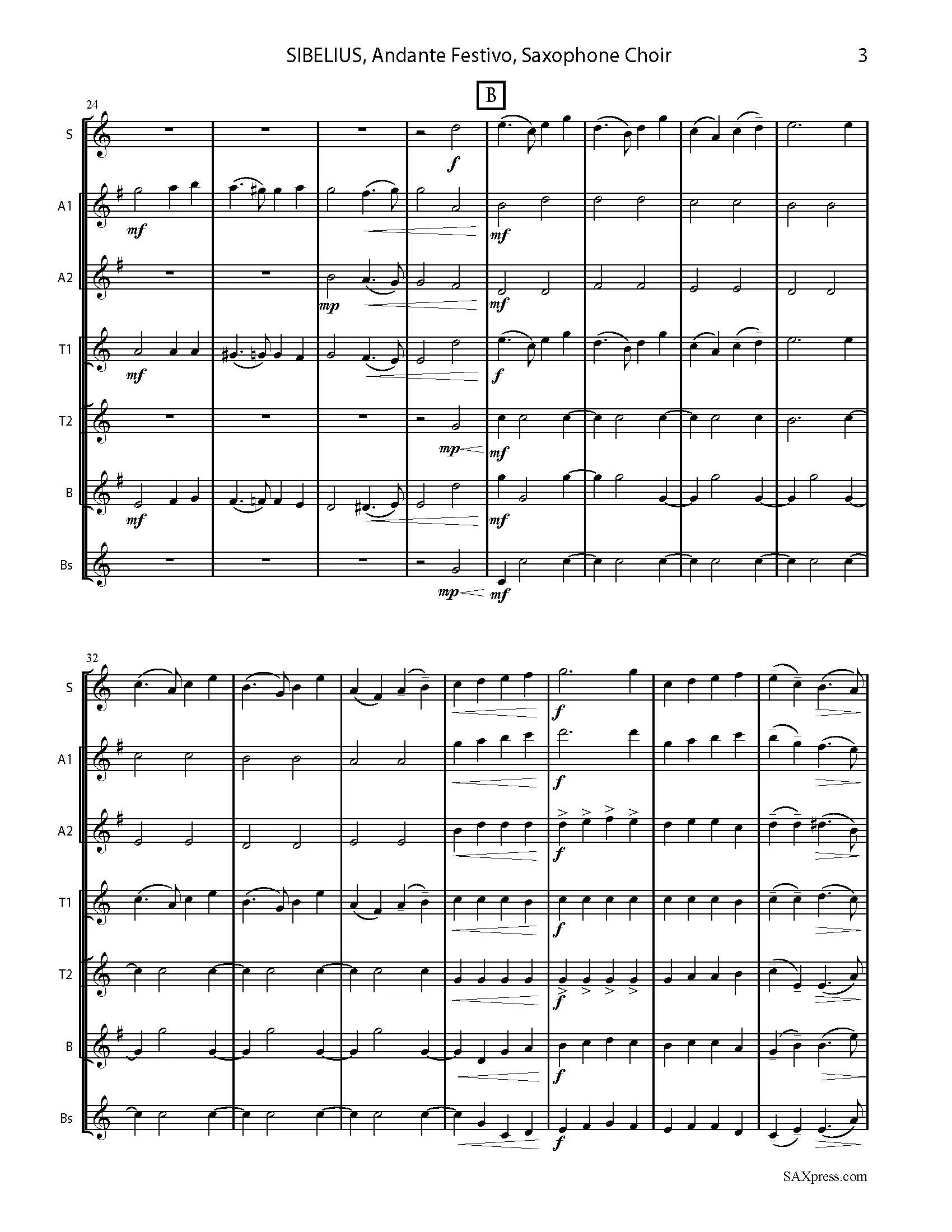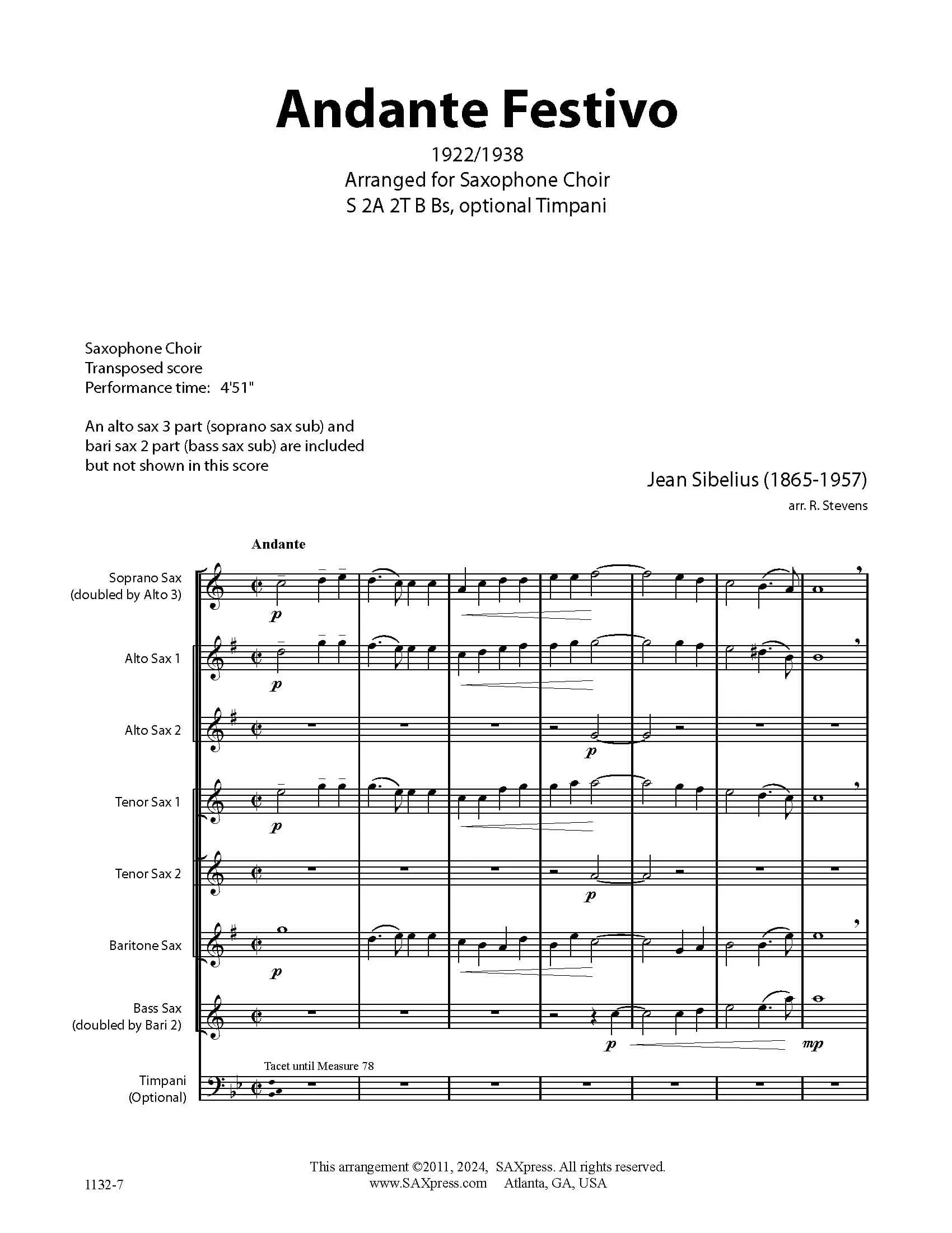 Andante Festivo by Jean Sibelius arranged for saxophone choir. This work is a single movement composition by Jean Sibelius written in 1922 originally scored for string quartet. In 1938, the composer arranged it for string orchestra and timpani. Full-voiced and sonorous, Andante Festivo is constructed as a smooth, continuous stream of hymn-like melodic phrases that flow in and out of each other. This arrangement is for saxophone choir SAATTBBs with optional timpani. Substitute parts are included for soprano and bass saxes to allow flexibility in your ensemble. This arrangement includes the following: