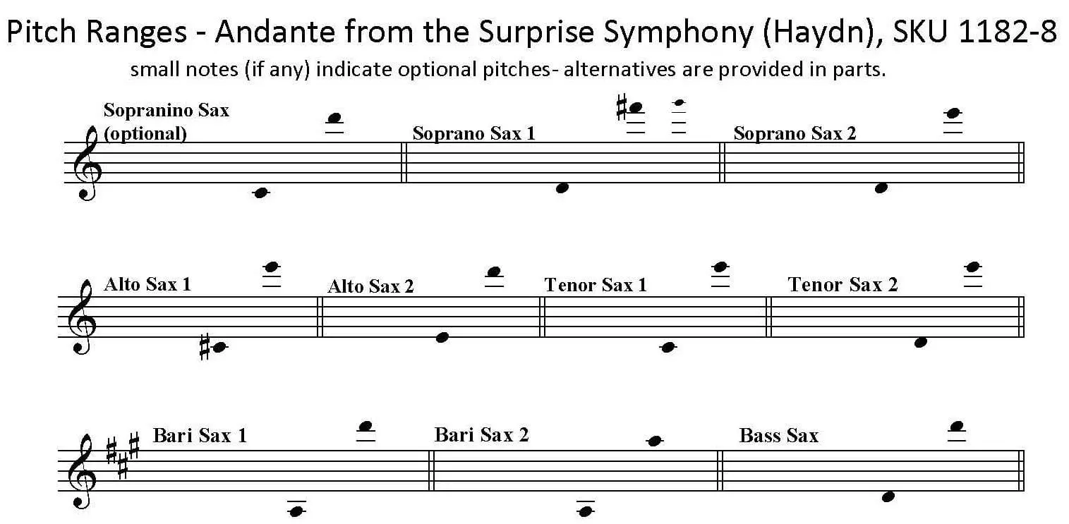 Andante from the Surprise Symphony (No. 94 in G major) by Haydn, arranged for saxophone choir (saxophone octet) with optional timpani. This transcription is in the original key and includes the following parts: