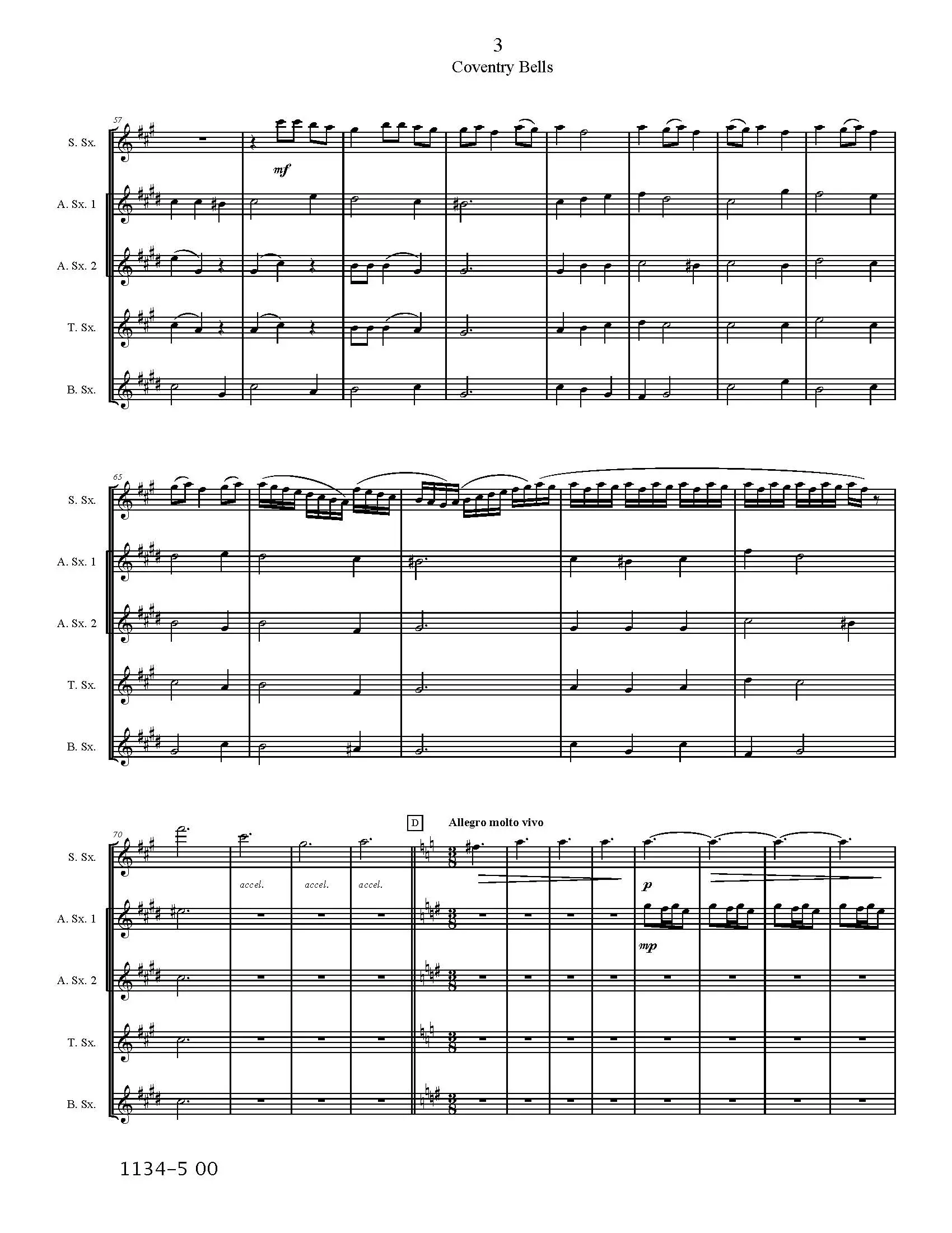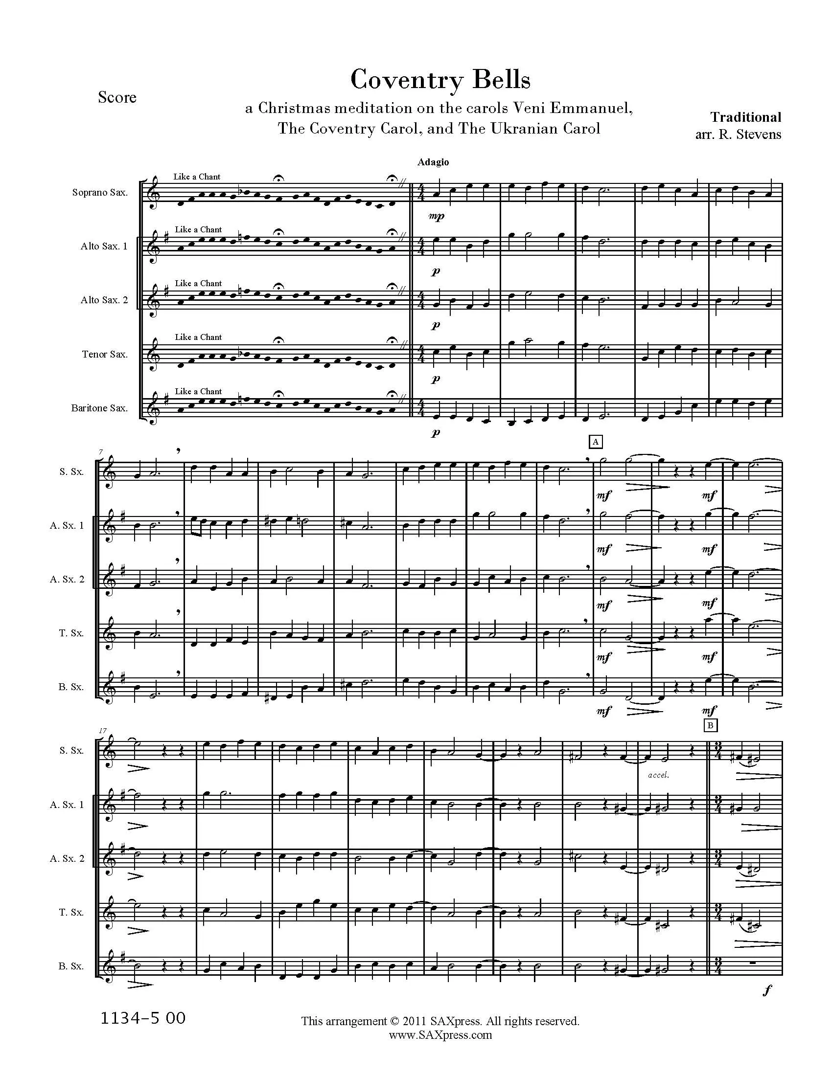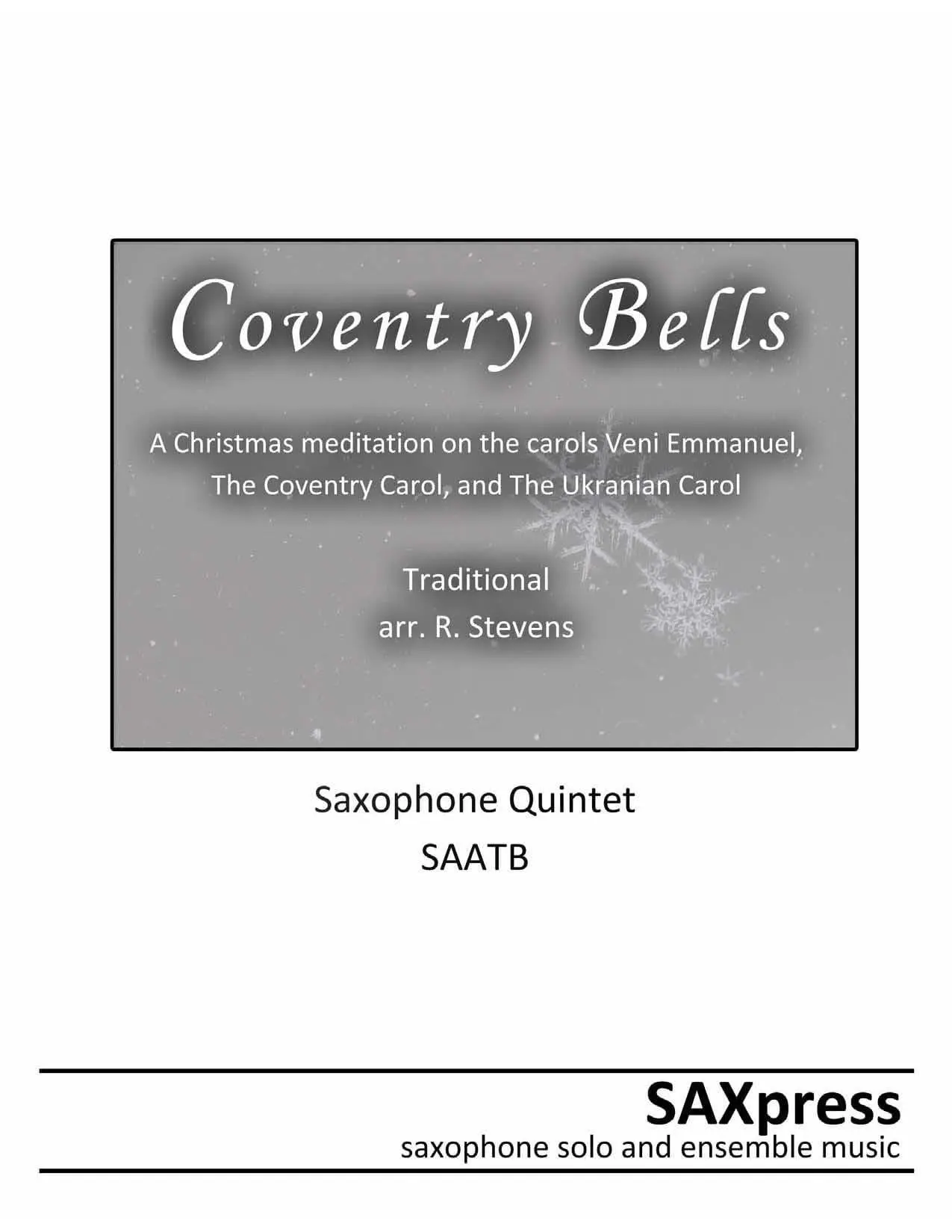 Coventry Bells: A Christmas Meditation. Christmas music for saxophones . Based on well known Christmas carols (Carols Veni Emmanuel, the Coventry Carol, and the Ukranian Carol), this saxophone quintet presents a variety of textures and moods as it explores three holiday themes.