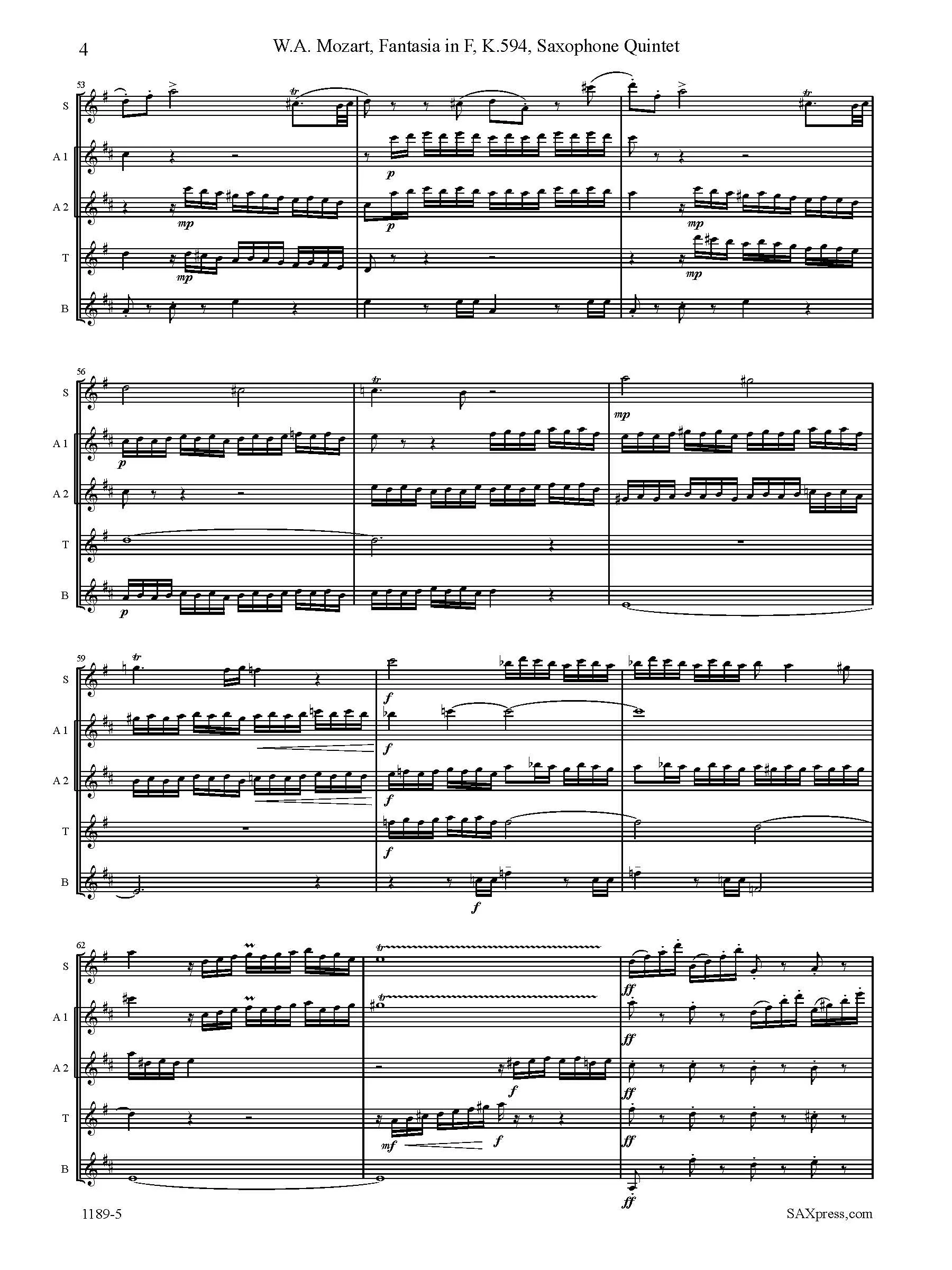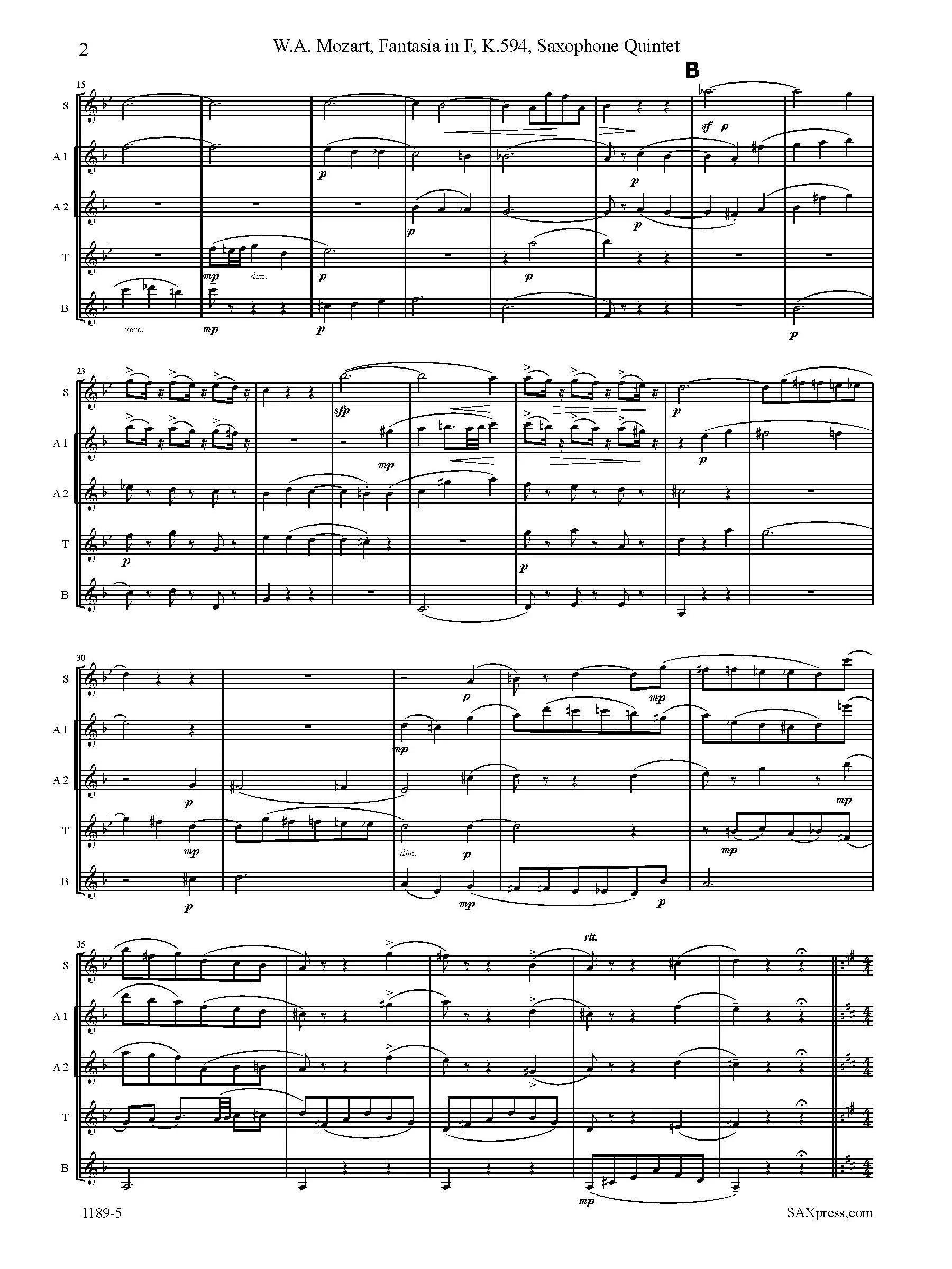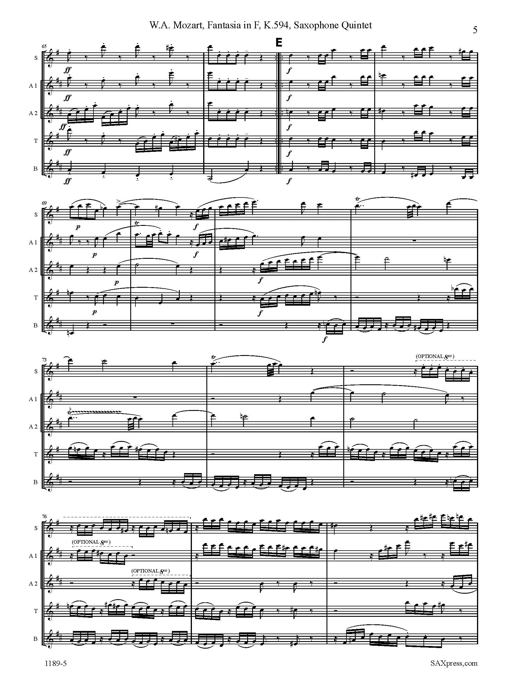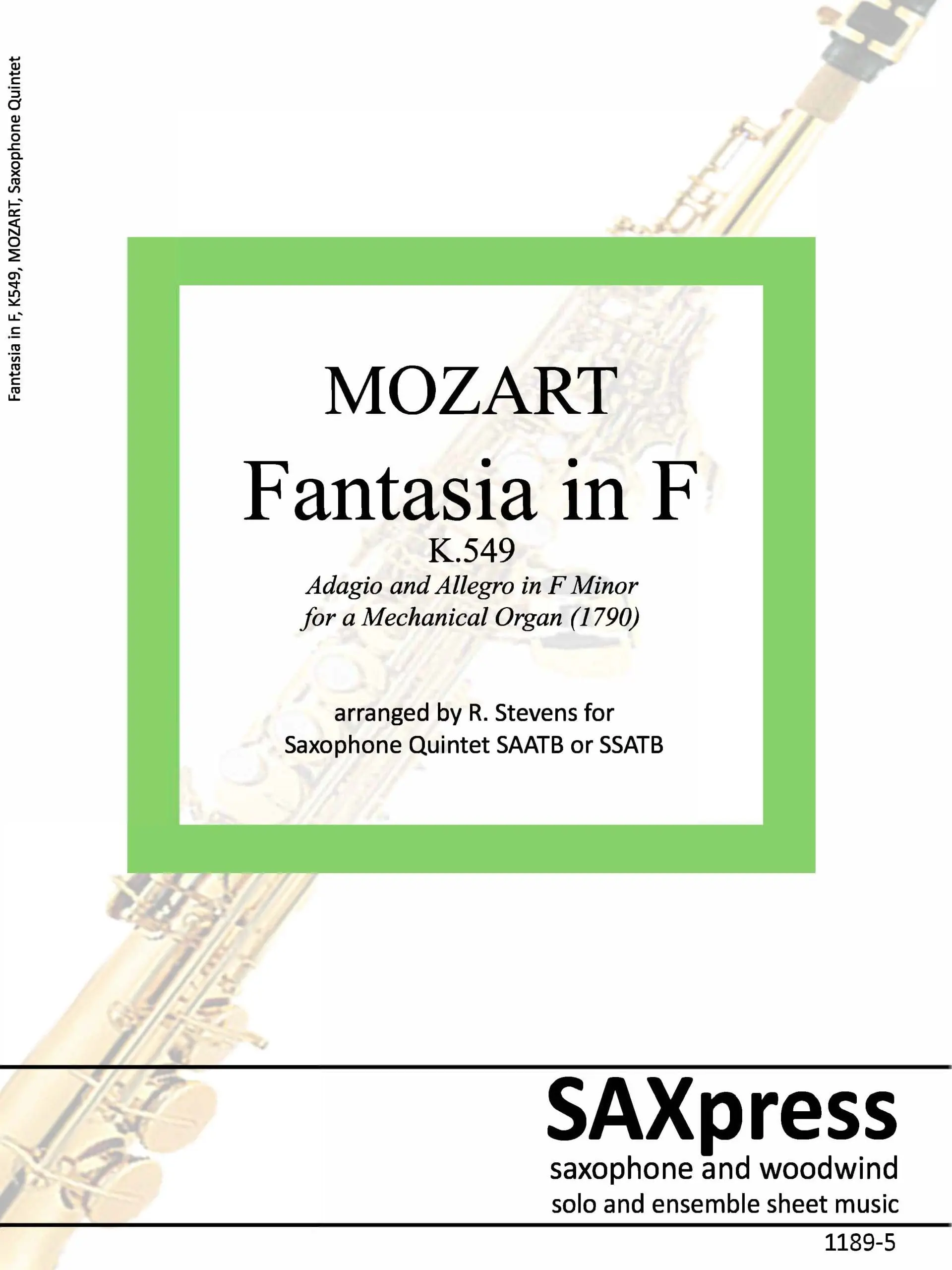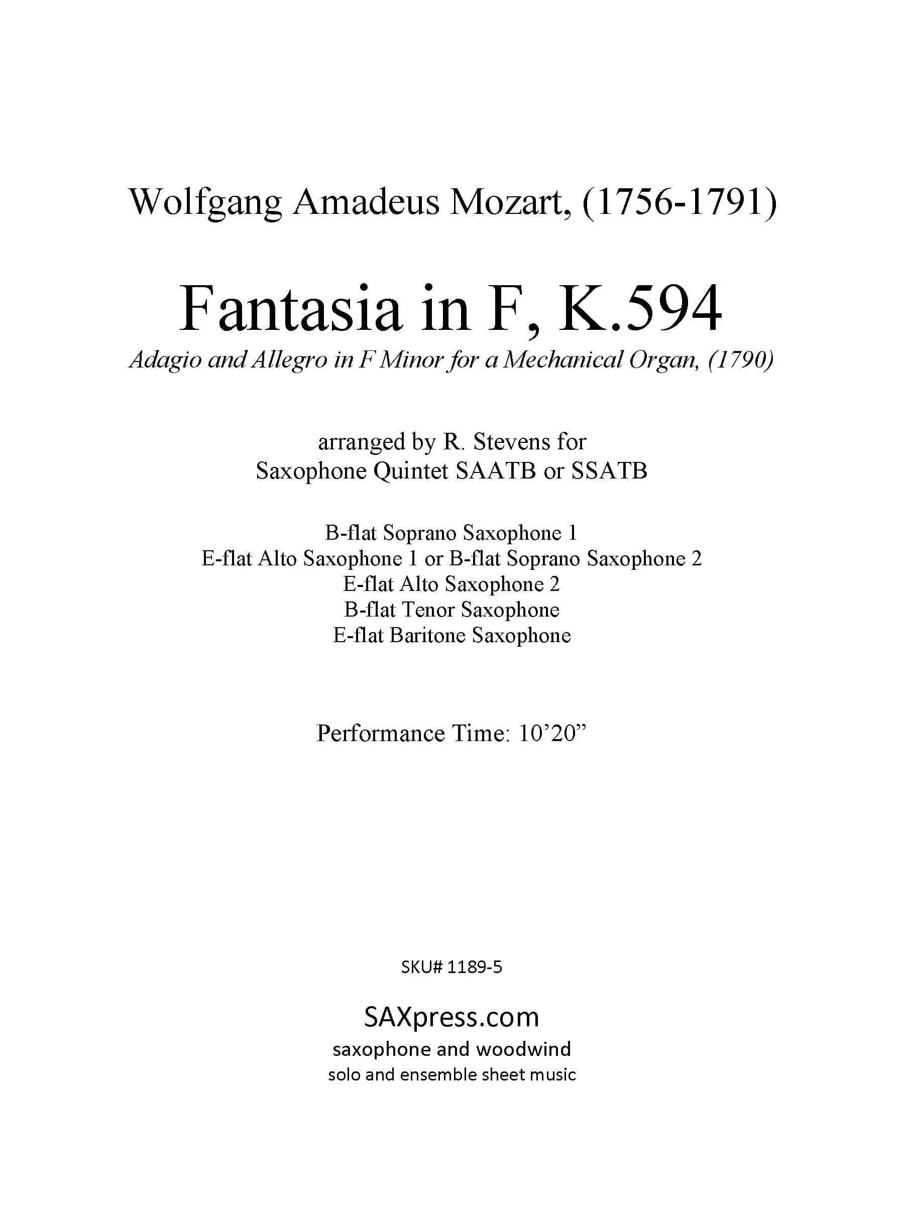 Fantasia In F, K. 594 by Mozart, arranged for Saxophone Quintet SAATB or SSATB. Although originally intended for a mechanical organ, this piece is also well known in arrangements for duo pianos, string quartet, orchestra, and woodwind quintet.
