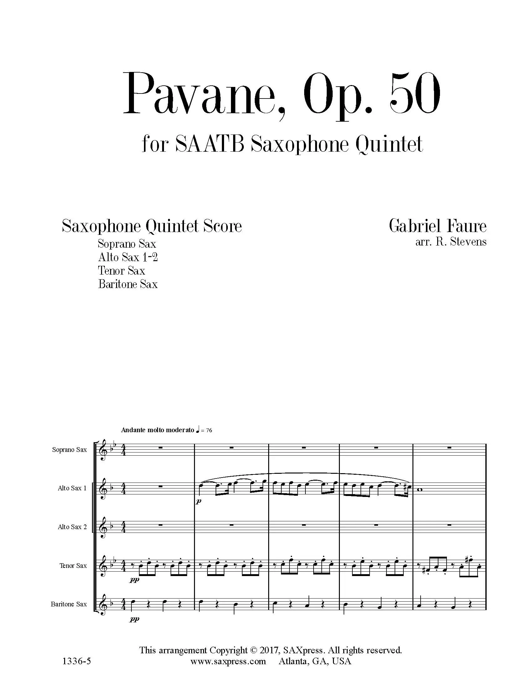 Pavane, Op. 50 by Gabriel Faure, arranged for Saxophone Quintet SAATB. The original version of Pavane was written for piano in the late 1880s. The composer described it as “elegant, but not otherwise important”. He orchestrated the work in the summer of 1887. At first Fauré planned a purely orchestral composition but after he decided to dedicate the work to his patron, Countess Greffulhe, he felt compelled to produce a grander affair. At her recommendation he added an off-stage chorus to accompany the orchestra. The choral lyrics were based on some inconsequential verses contributed by the Countess’s cousin, on the romantic helplessness of man, and about squabbling dancers.