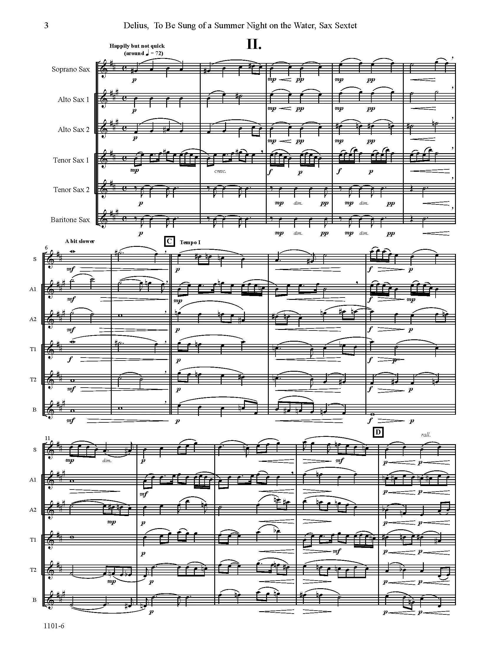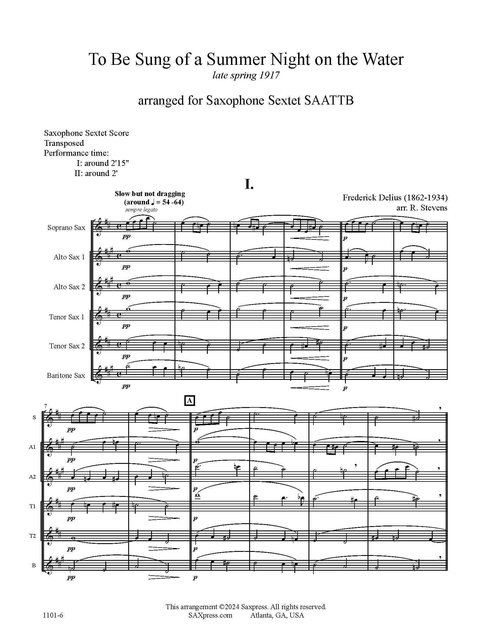 To Be Sung of a Summer Night on the Water by Frederick Delius, arranged for saxophone sextet. Delius wrote this originally as a wordless choral work. There are two short sections. The first is a dreamy idyll with rich chromaticism and gentle lines that convey an ethereal, bucolic quality. The second section is a bouncy, nonchalant tune that will very likely get stuck in your head as an earworm if you let it. The tune is passed back and forth between the tenor 1 and the alto 1 parts. The piece was later set for string orchestra. This arrangement is for saxophone sextet, SAATTB. It is not technically difficult; instead, this piece is an exercise in dynamics and phrasing.