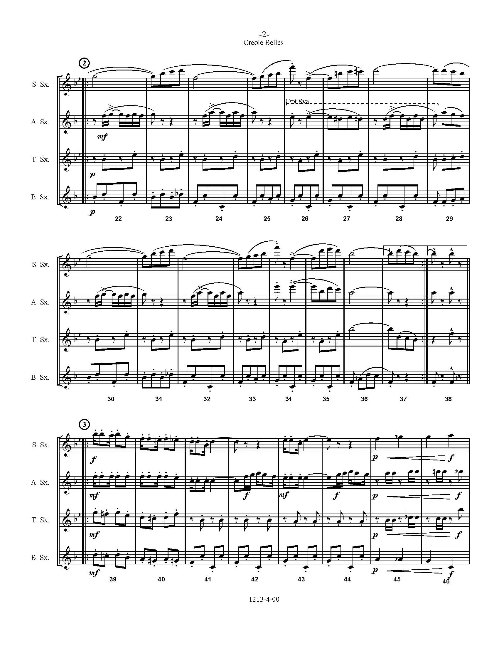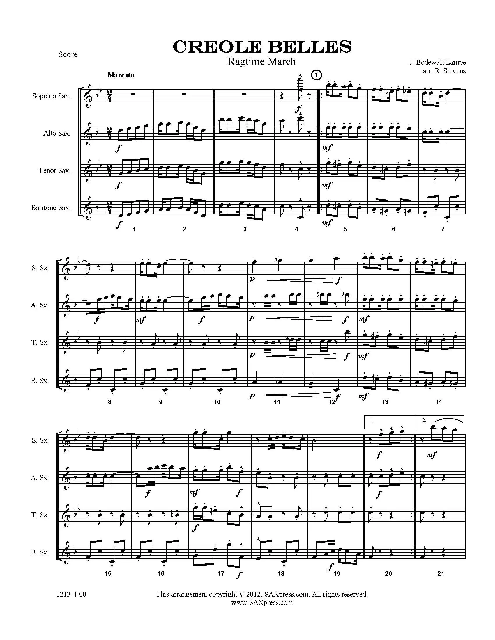 Creole Belles Ragtime March by Lampe, arranged for S/AATB Saxophone Quartet. This is a tuneful little rag that will have your audience tapping their toes, Creole Belles, by J. Bodewalt Lampe, features the Soprano and Alto Saxes in the first two sections then the Tenor steps in with a bouncy melody. The Bari sax plays a ragtime bass line throughout to tie the piece together. Lots of fun for everyone!