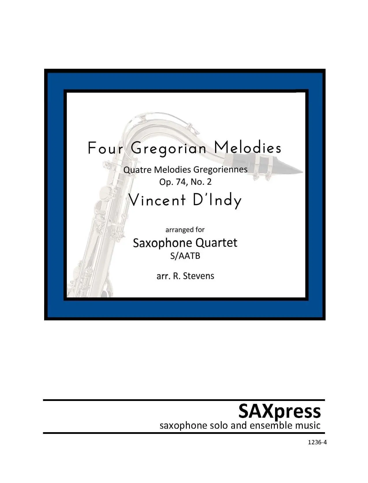 Four Gregorian Melodies, by Vincent D’Indy, arranged for Saxophone Quartet S/AATB. Four Gregorian Melodies is the second section of a set of piano pieces by D’Indy titled “For Children of All Ages”. Each of the four very brief movements is based on a different Gregorian mode. The first and last movements are slow and contemplative while the two middle movements are more lively. The movements are as follows: