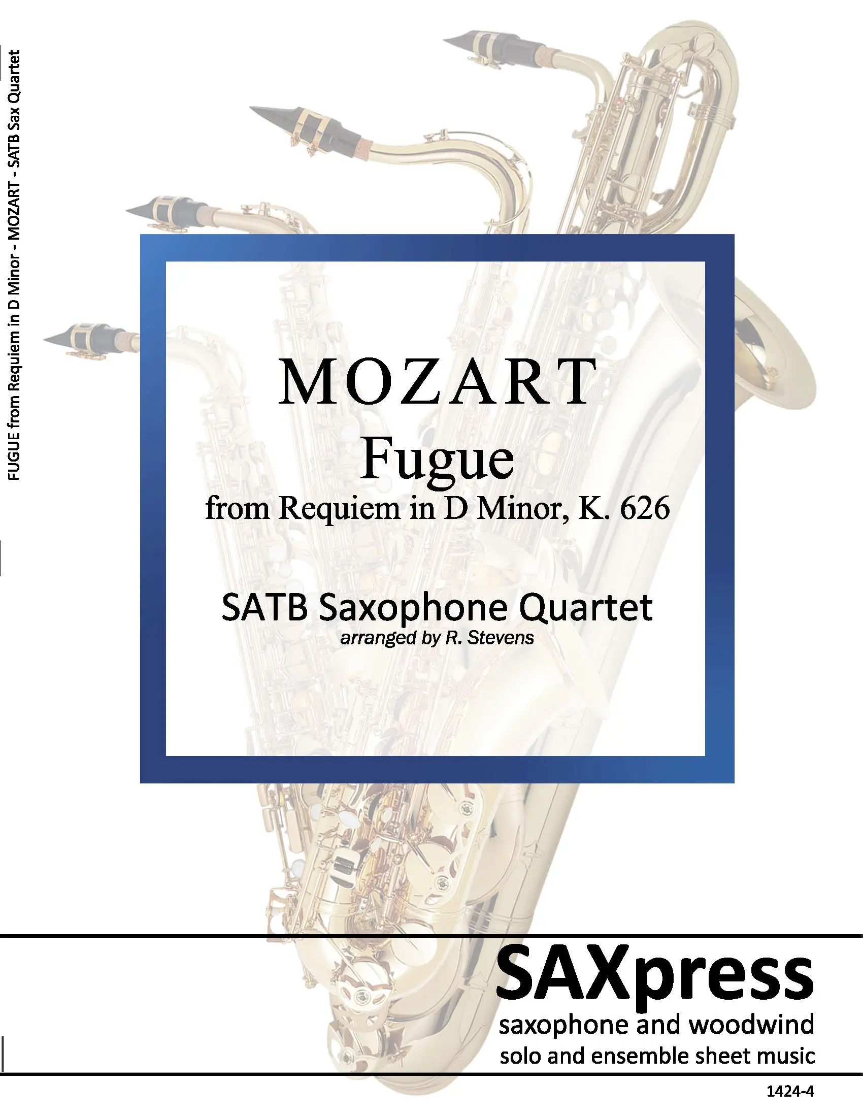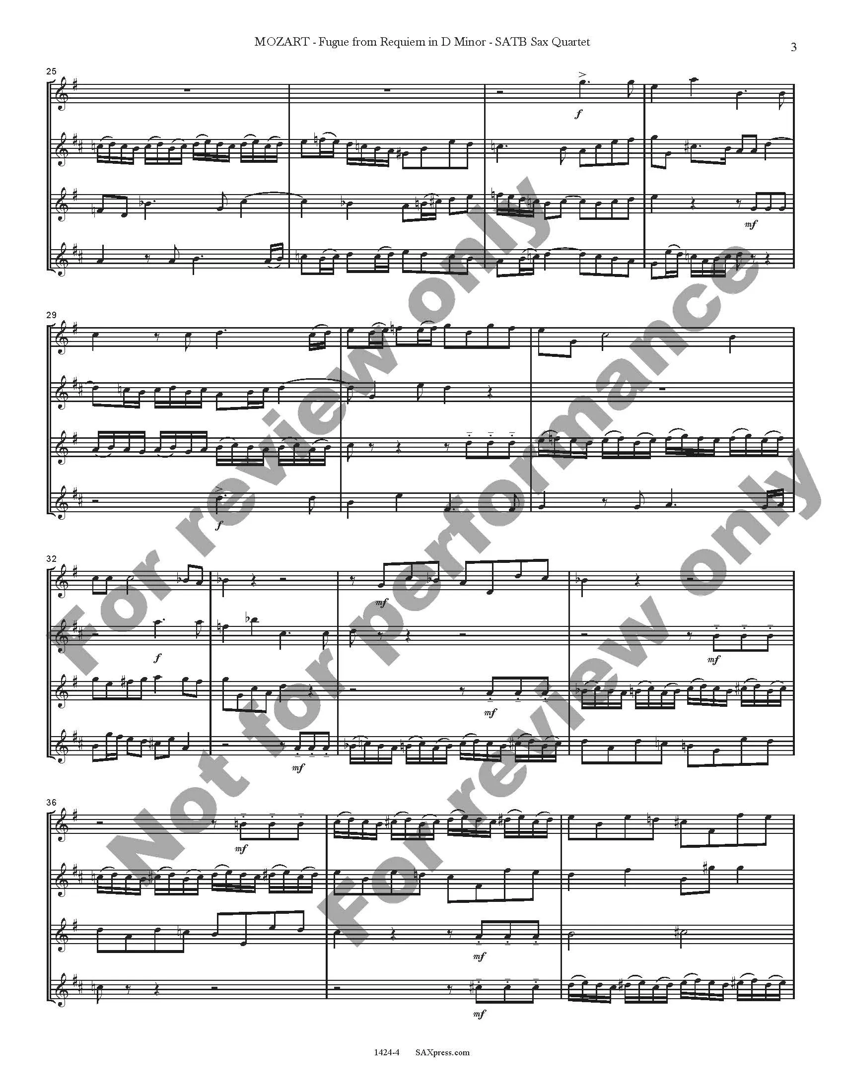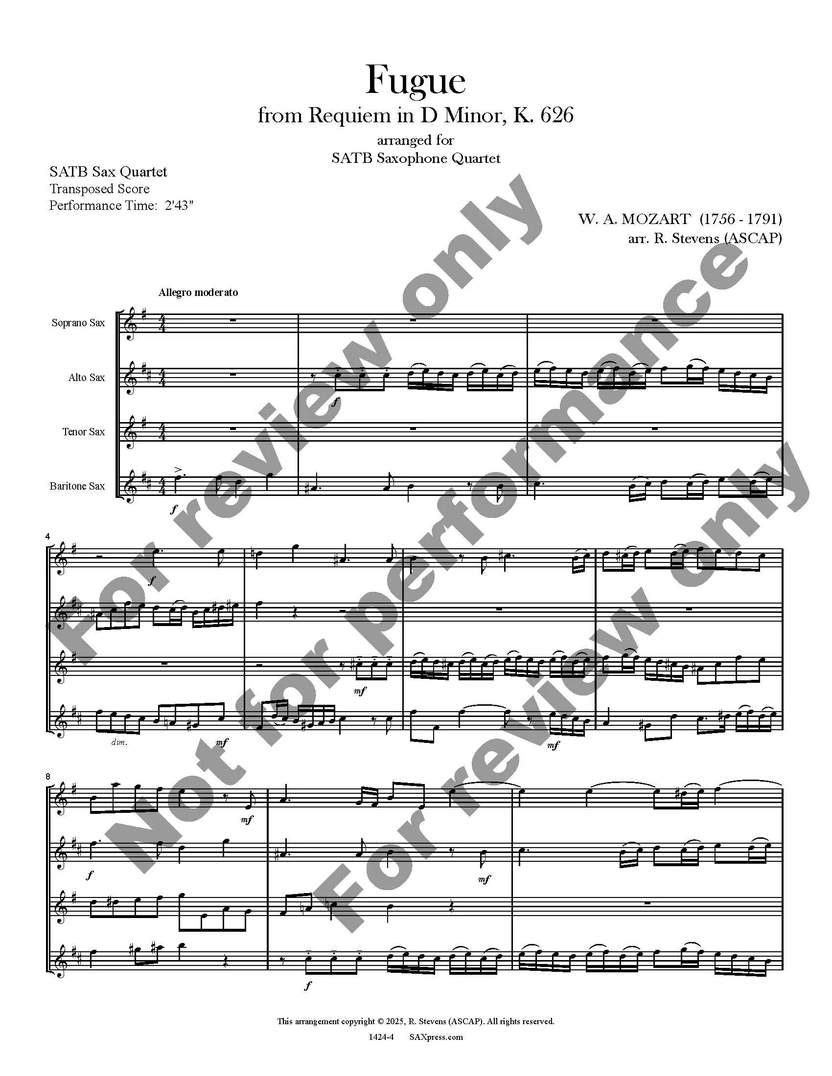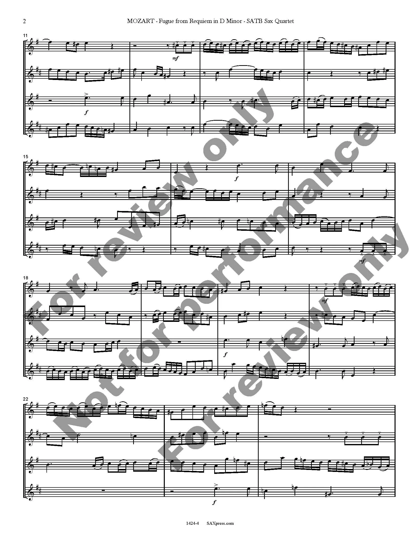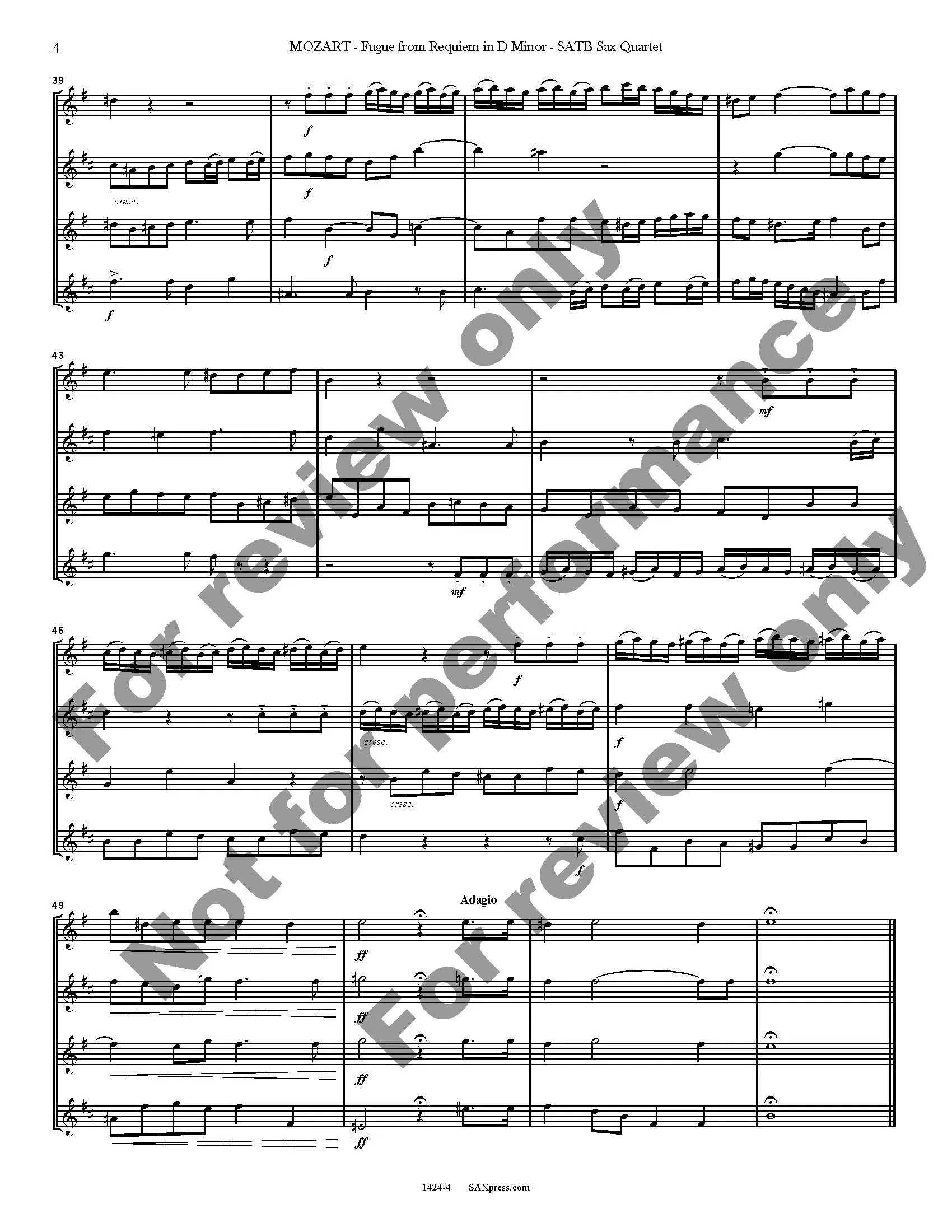 This short extract, a double fugue from Requiem, K. 626 by Mozart, provides quite a workout for all members of the sax quartet. At a moderate tempo, it is a good challenge for an intermediate or advanced saxophone quartet.