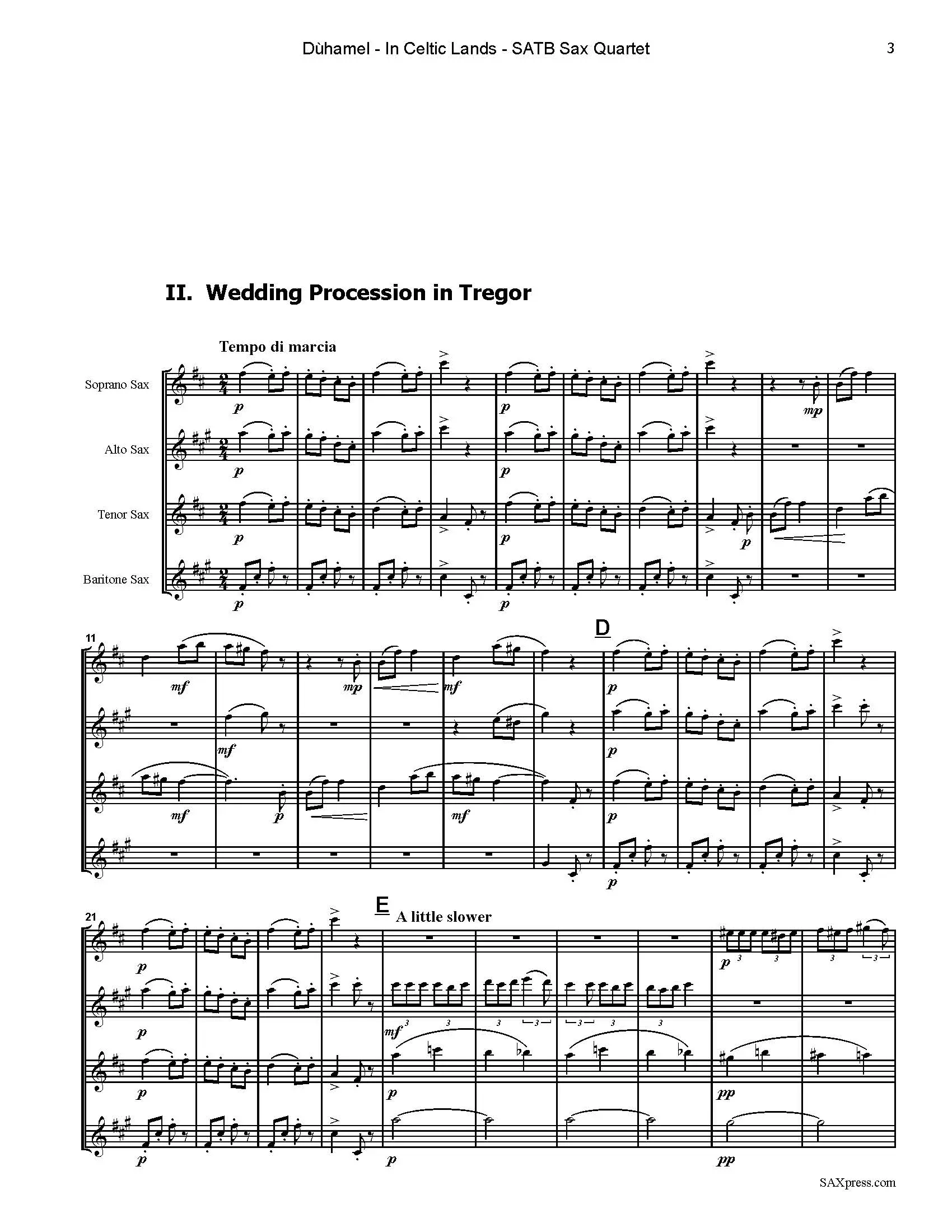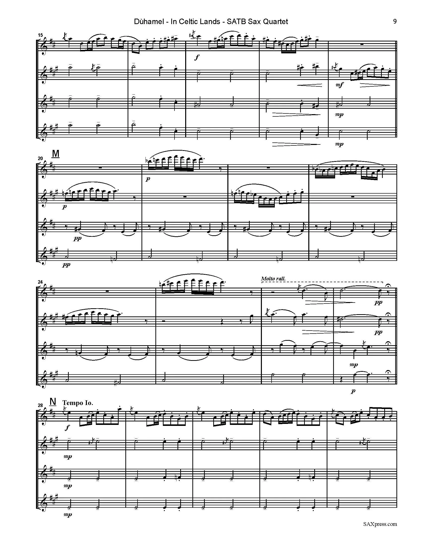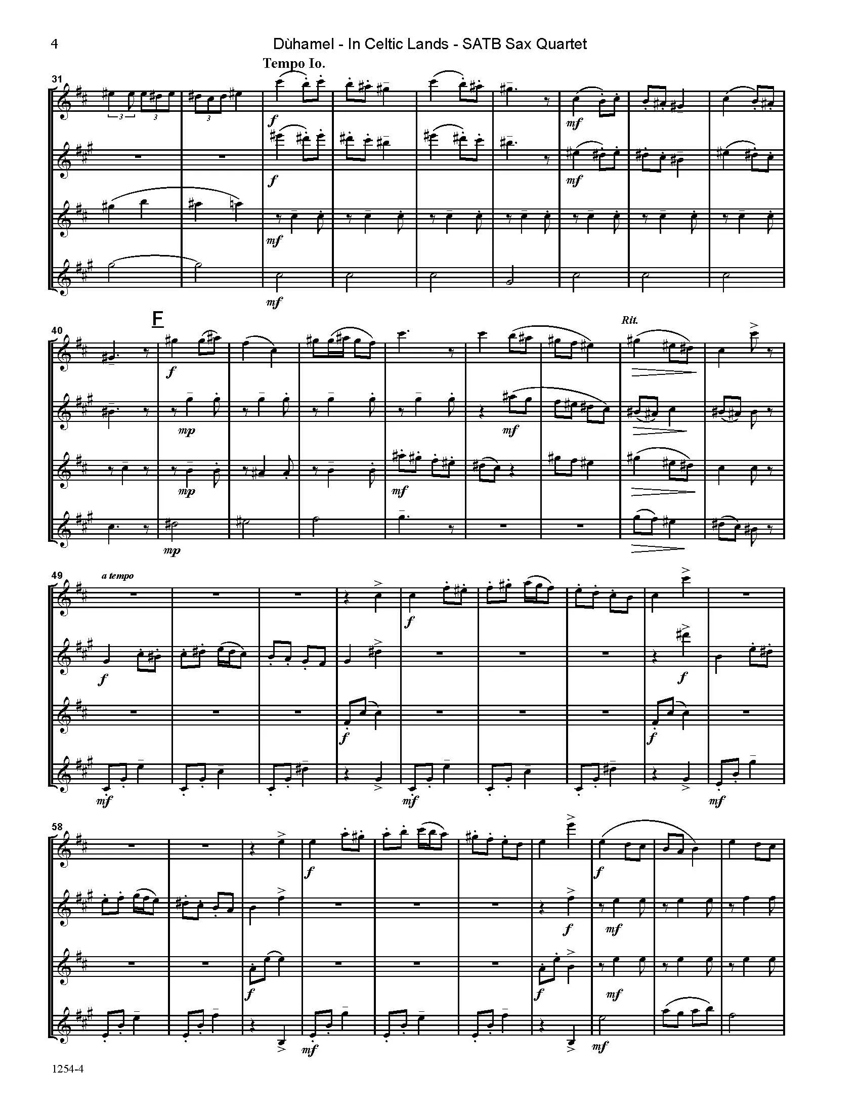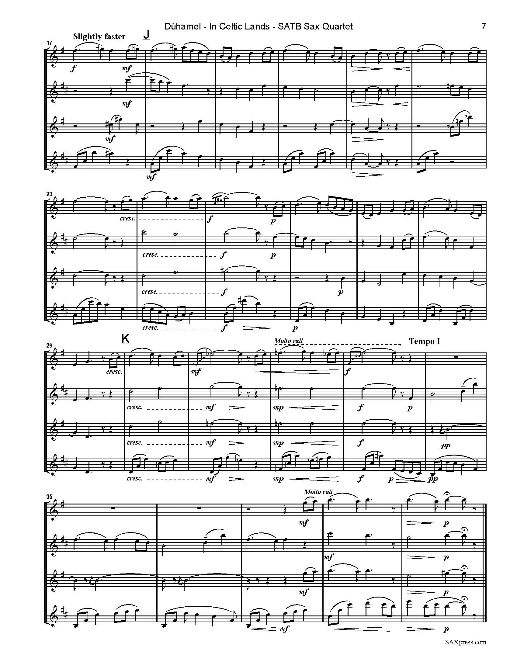 In Celtic Lands by Maurice Duhamel arranged for saxophone quartet SATB. This work was originally written by Duhamel as a suite of short pieces for piano. The movements are based on traditional Breton melodies and motifs but some of their harmonies take a decidedly modern turn. The composer later set the work for orchestra. The movements are: