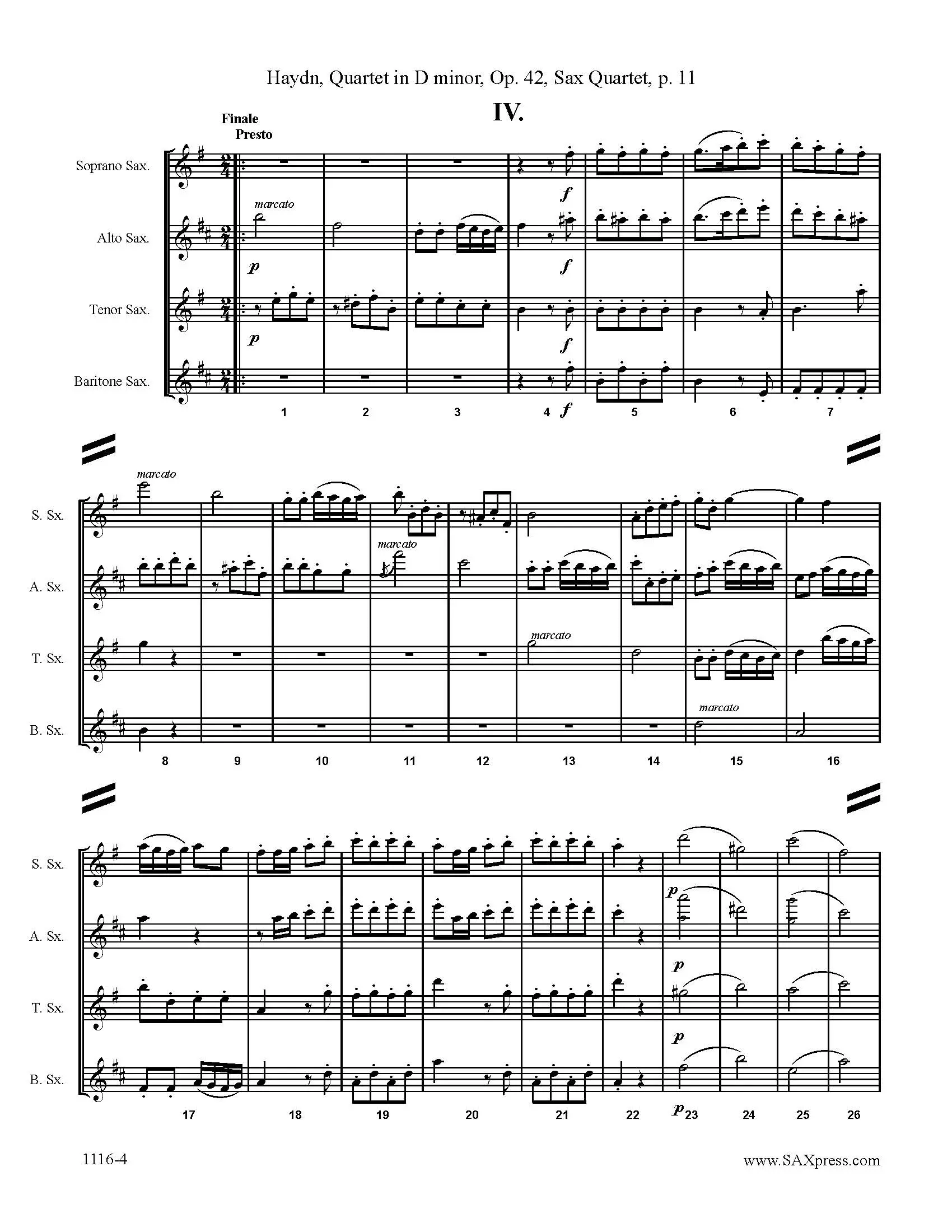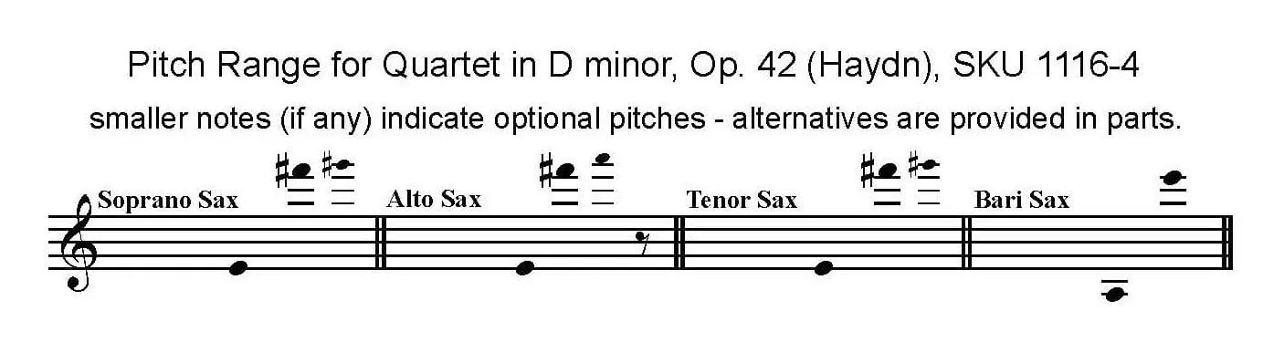 This string quartet transcription presents the music as Haydn wrote it. Nothing is omitted or altered. The third movement is famous for its extended range. Altissimo is required of Soprano, Alto, and Tenor players with alternate notes given where necessary and octave transpositions provided if required.