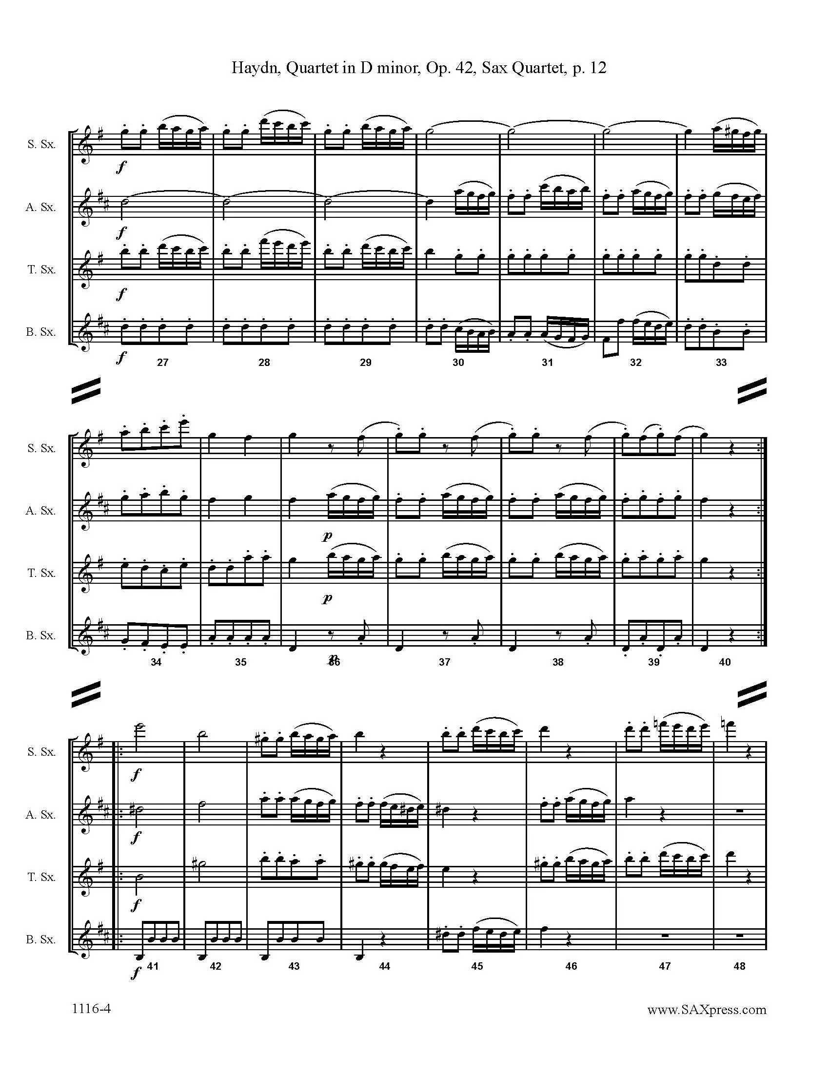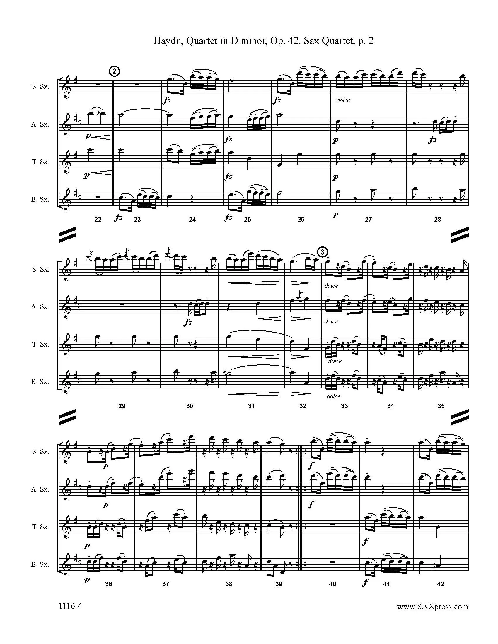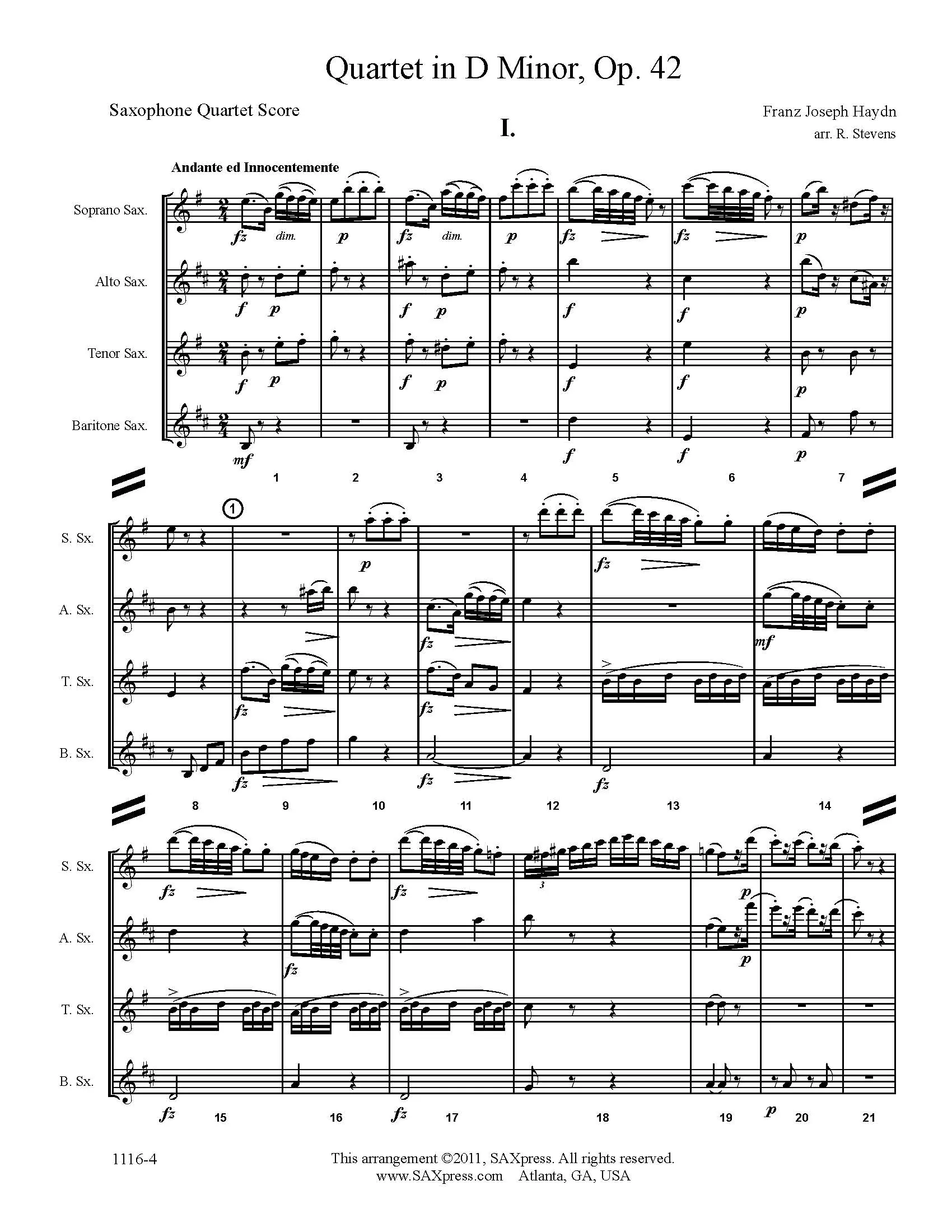 Quartet 35 in D minor, Op. 42, by Franz Joseph Haydn, string quartet transcription for SATB saxophone quartet. Haydn spent much of his career as a court musician for the wealthy Esterházy family on their remote estate. Isolated from other composers and trends in music until the later part of his long life, he was, as he put it, “forced to become original”. That originality is evident in the D minor Quartet, String Quartet 35 in D minor, Op. 42, H. 3/43