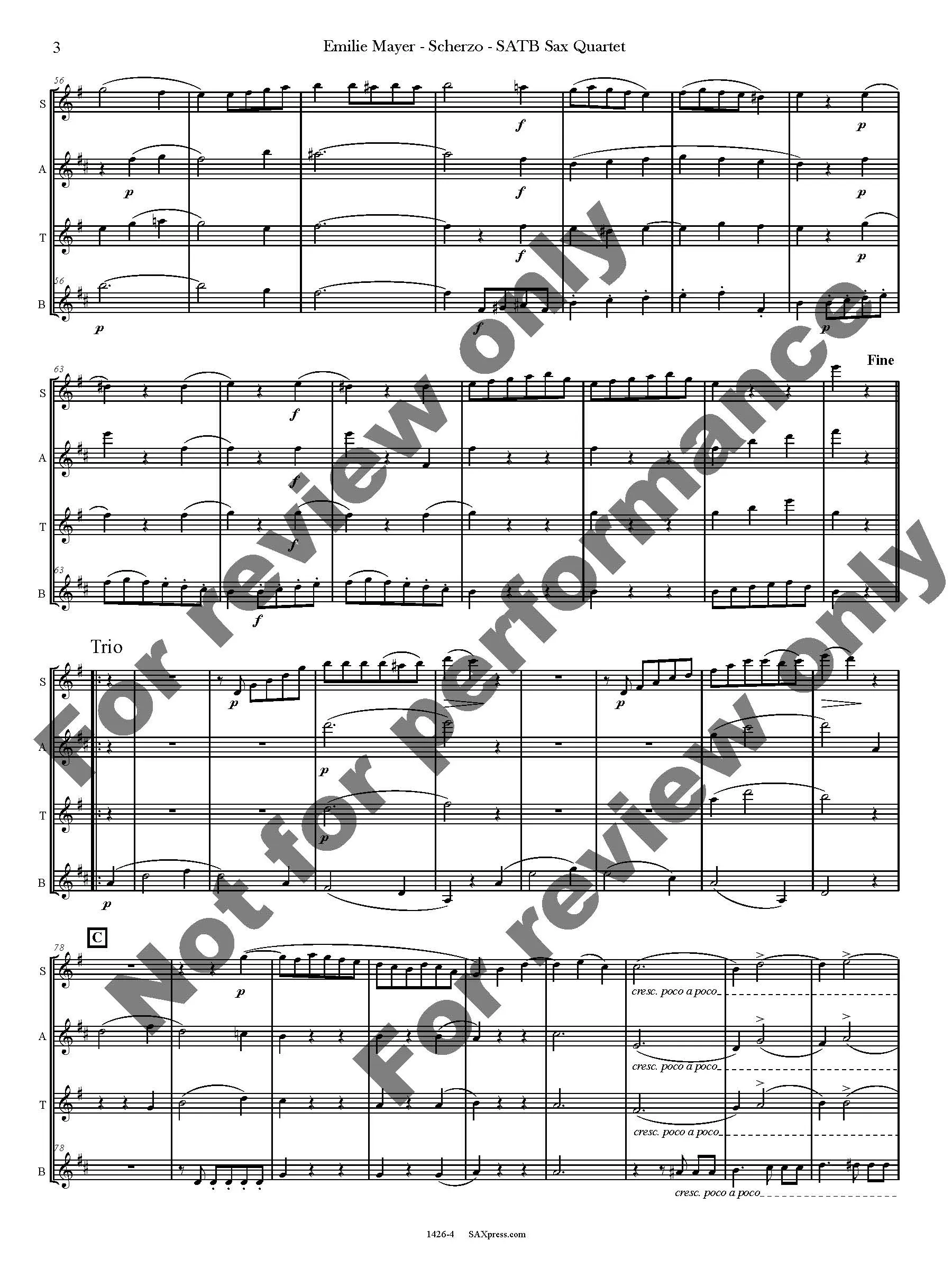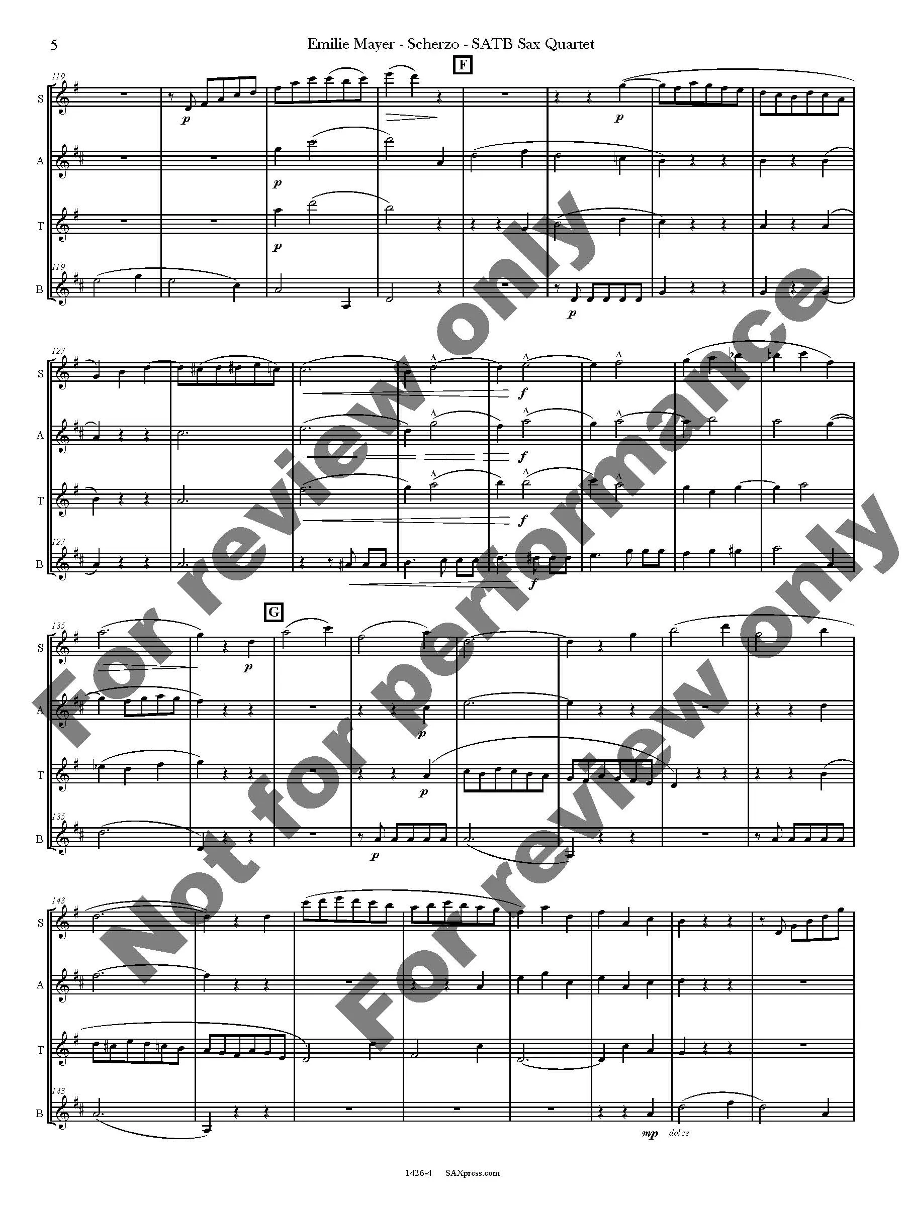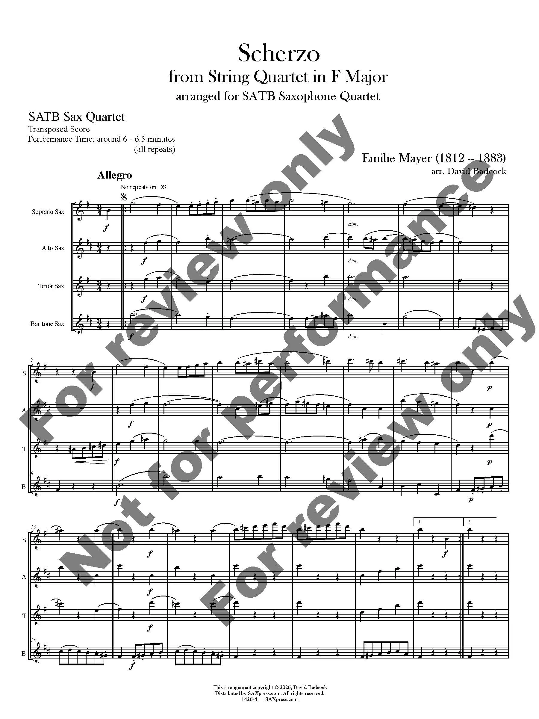 This arrangement of Scherzo is for SATB Saxophone Quartet. The scherzo is in the original key of F major. The tempo is a fast allegro throughout with no tempo changes. Performance time is about 6 minutes with all repeats. If no repeats are taken in the trio section, performance time is around 4.5 minutes. With a little work, a good high school quartet should find success with this piece.