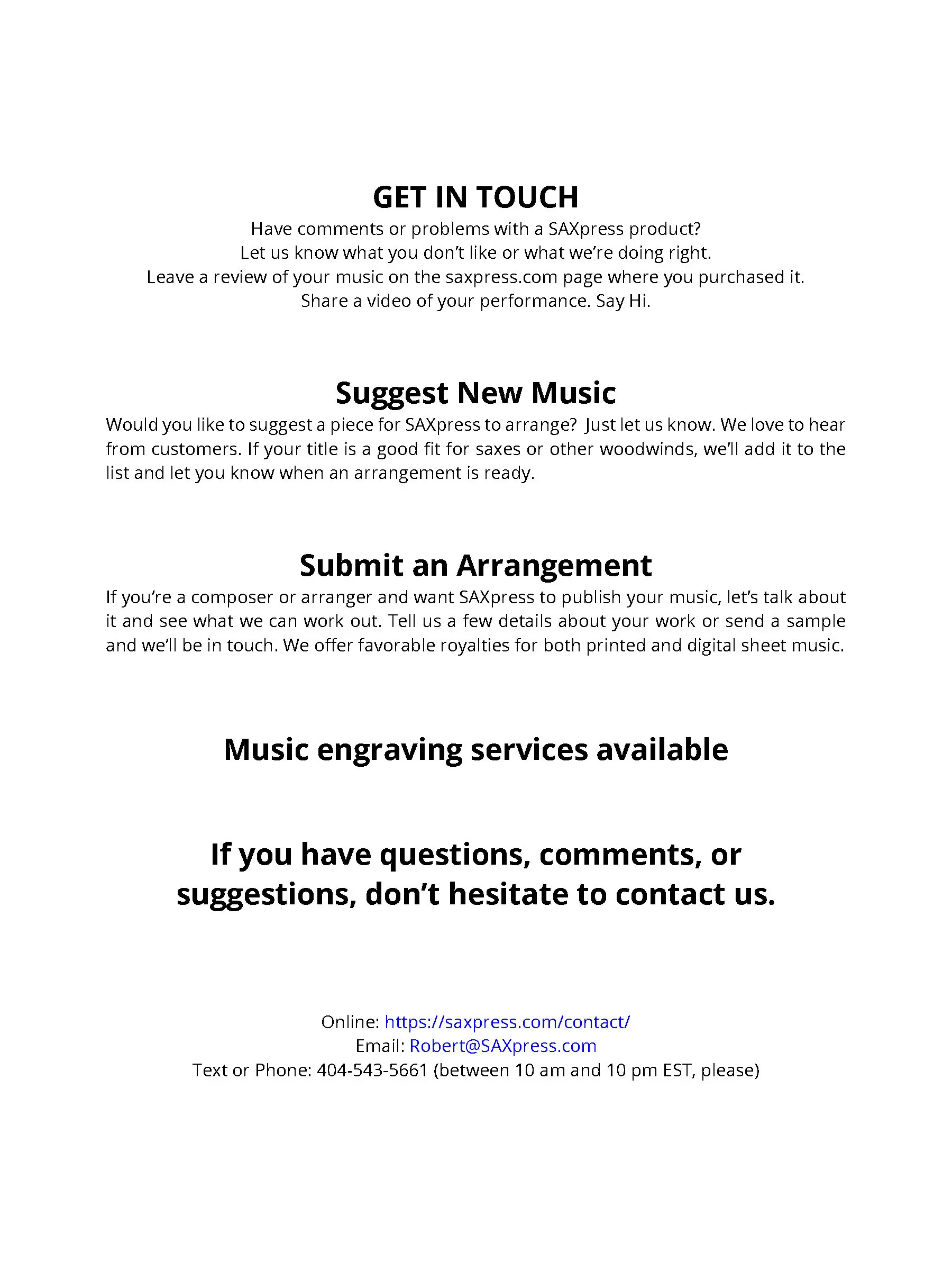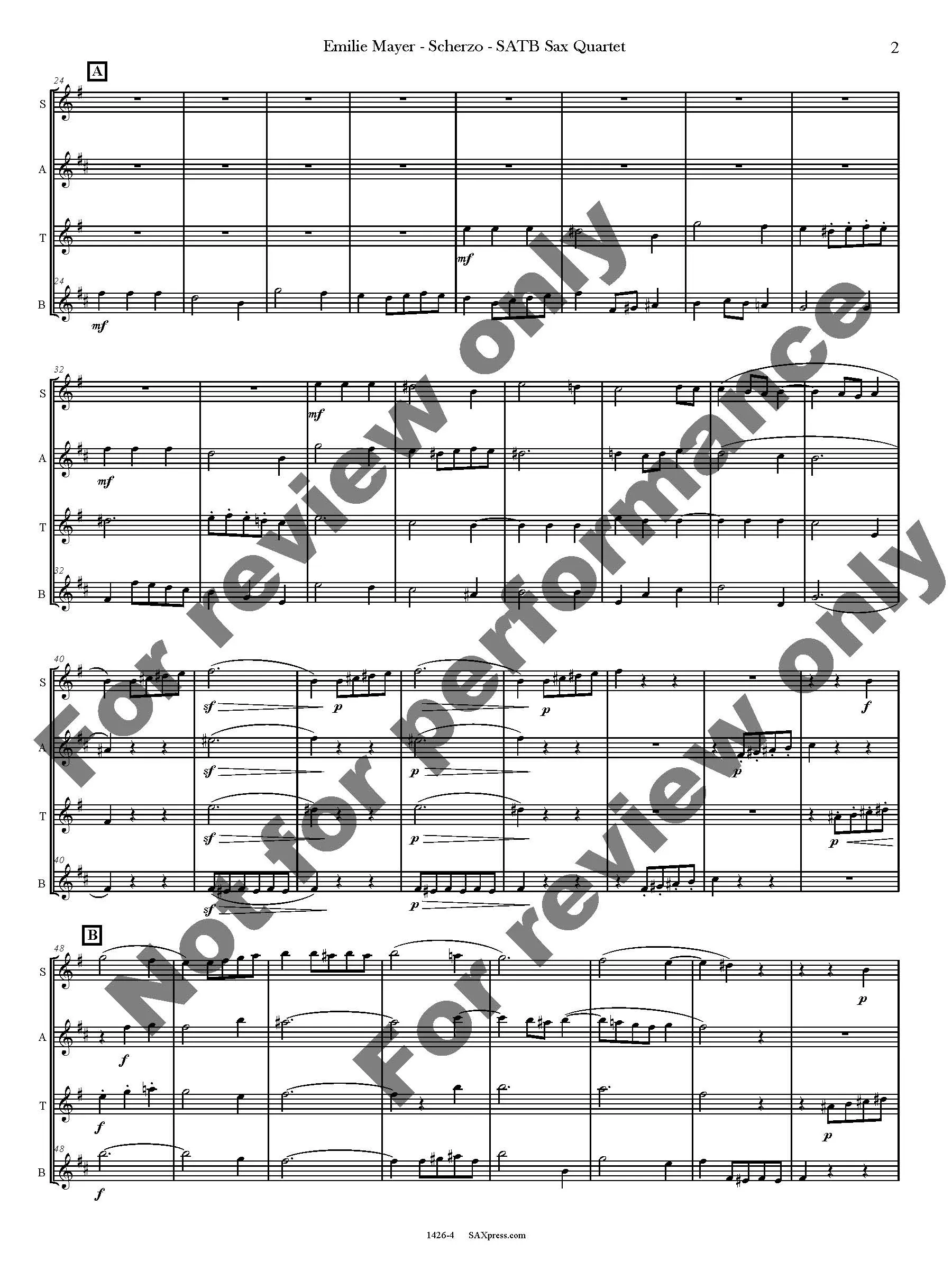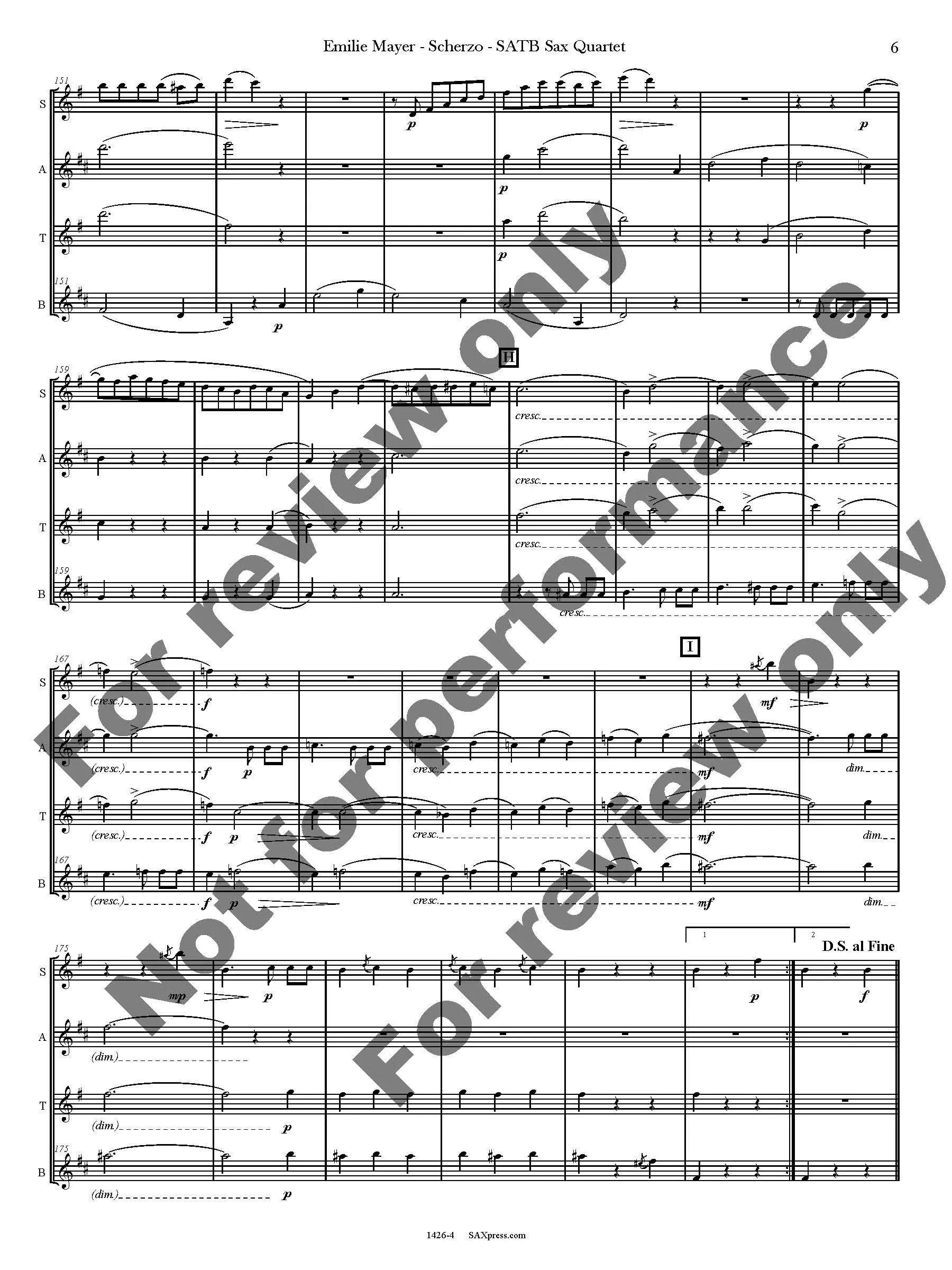 This arrangement of Scherzo is for SATB Saxophone Quartet. The scherzo is in the original key of F major. The tempo is a fast allegro throughout with no tempo changes. Performance time is about 6 minutes with all repeats. If no repeats are taken in the trio section, performance time is around 4.5 minutes. With a little work, a good high school quartet should find success with this piece.