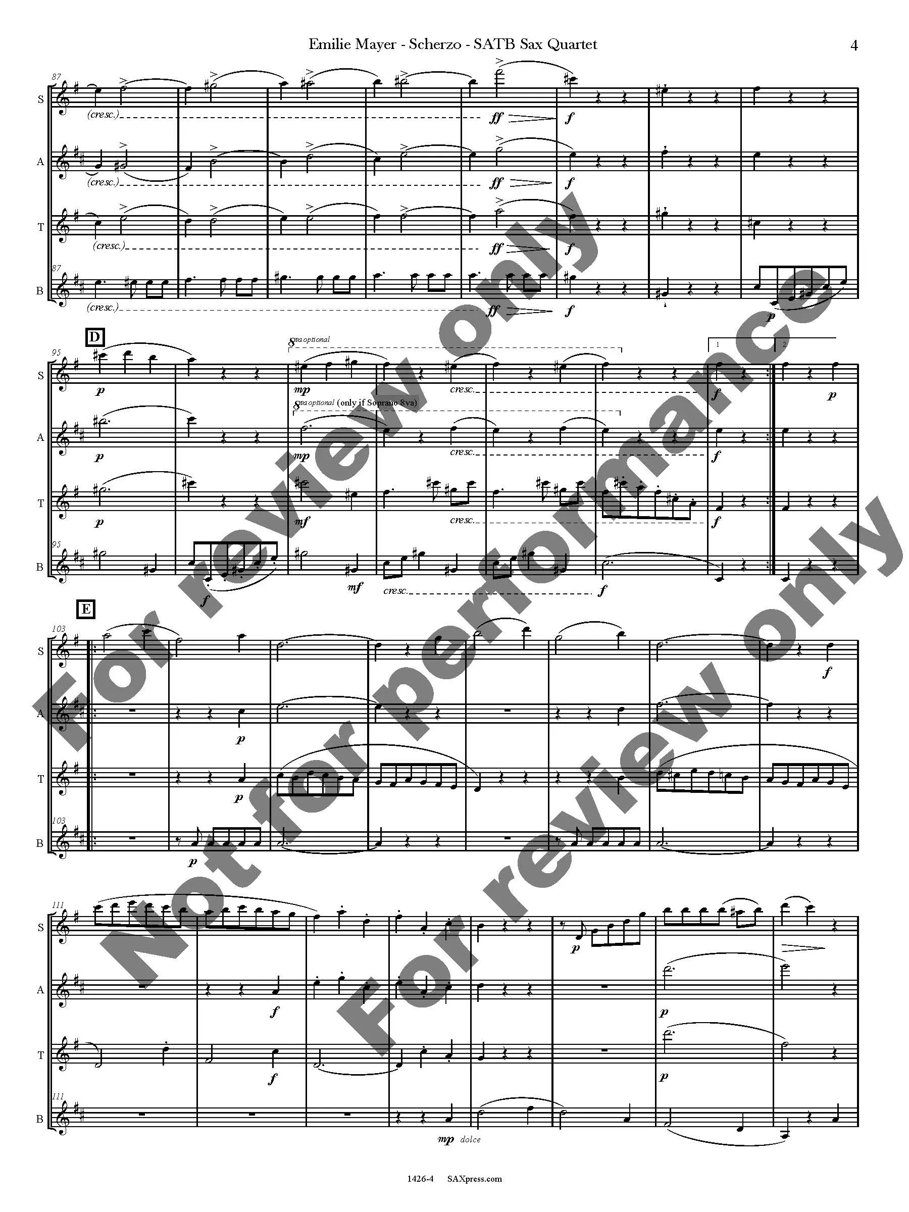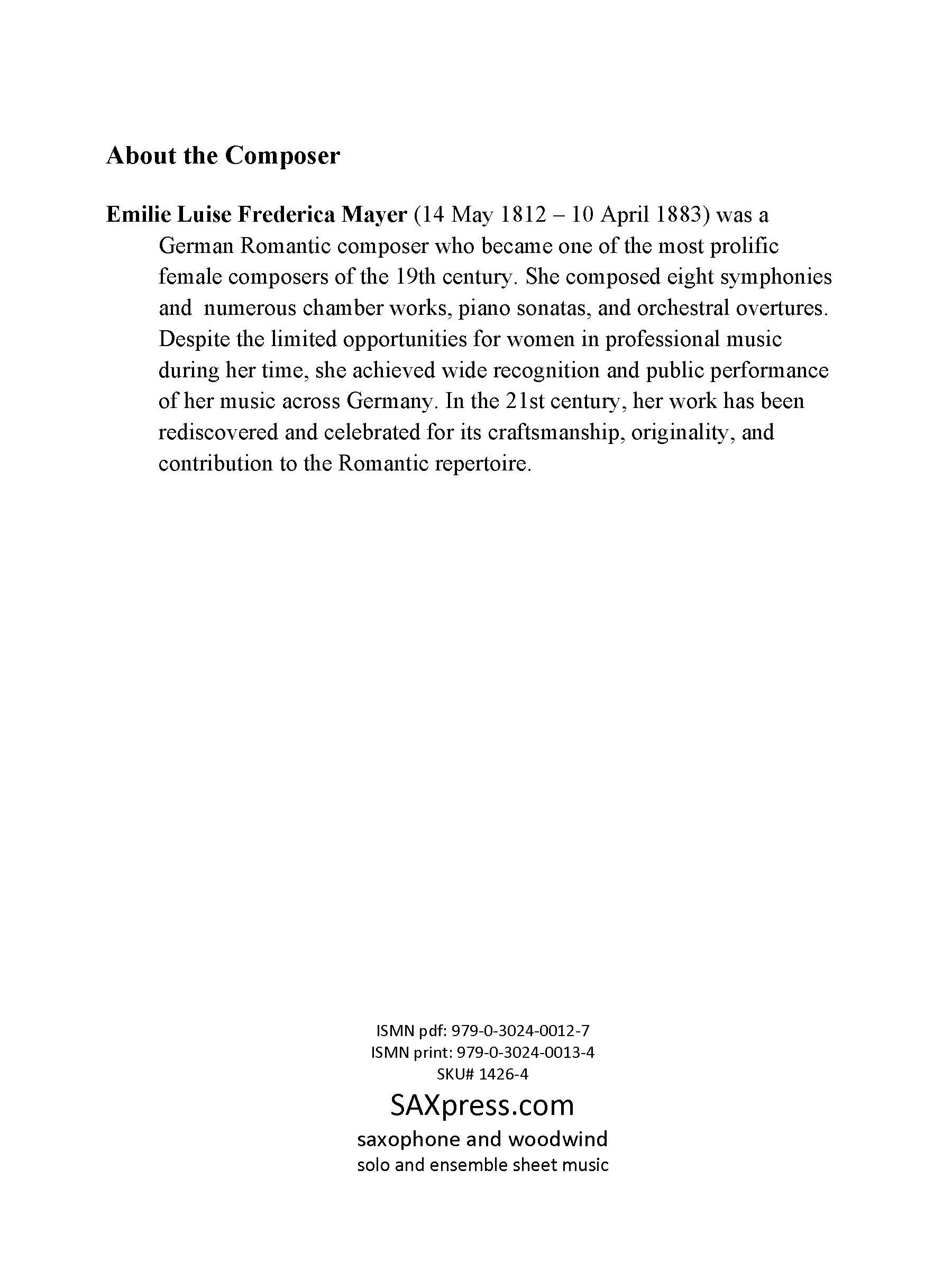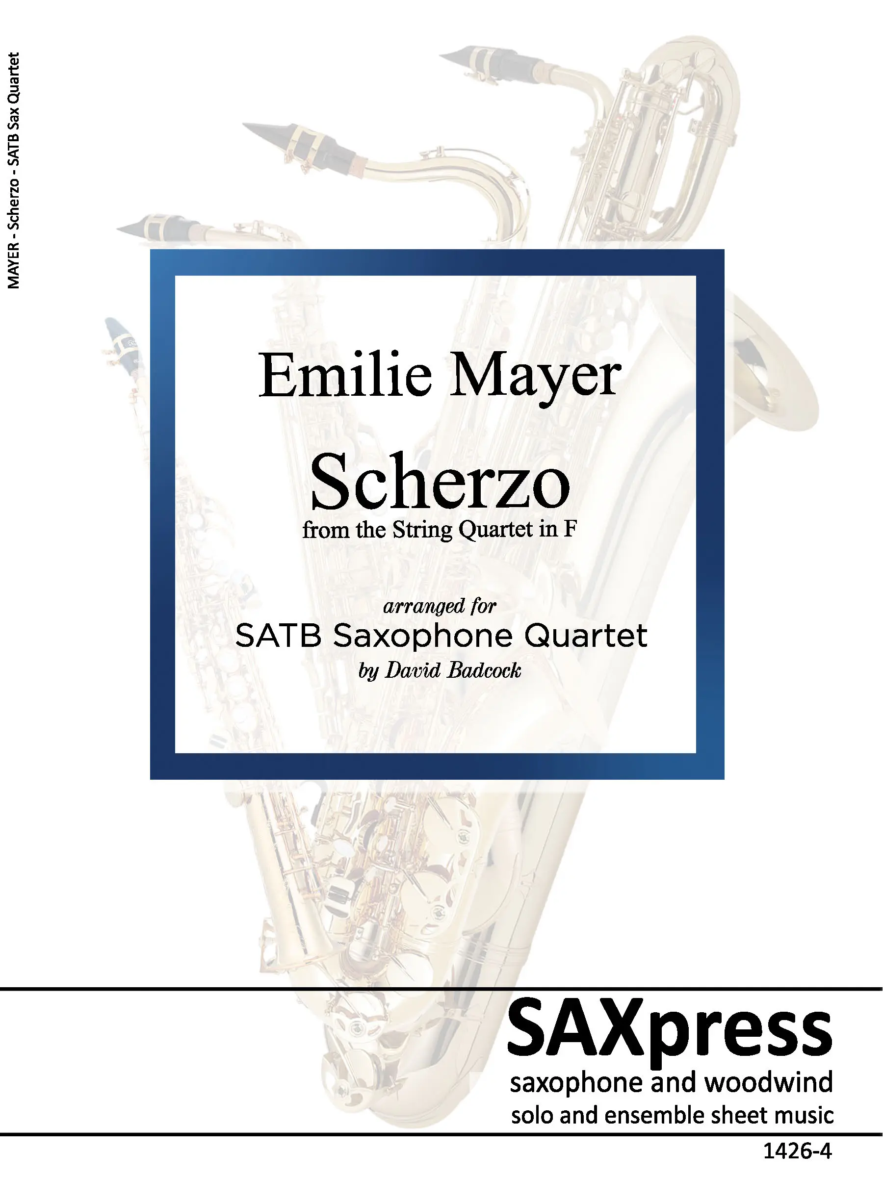 Scherzo by Emilie Mayer arranged for SATB Saxophone Quartet. The String Quartet in F (ca. 1850), is a demonstration of Mayer’s mastery of the form. The light-hearted scherzo is the second movement. It is a very good fit for the saxophone quartet. There is an easy flow of melodies between the instruments. All the parts have a significant roll to play.