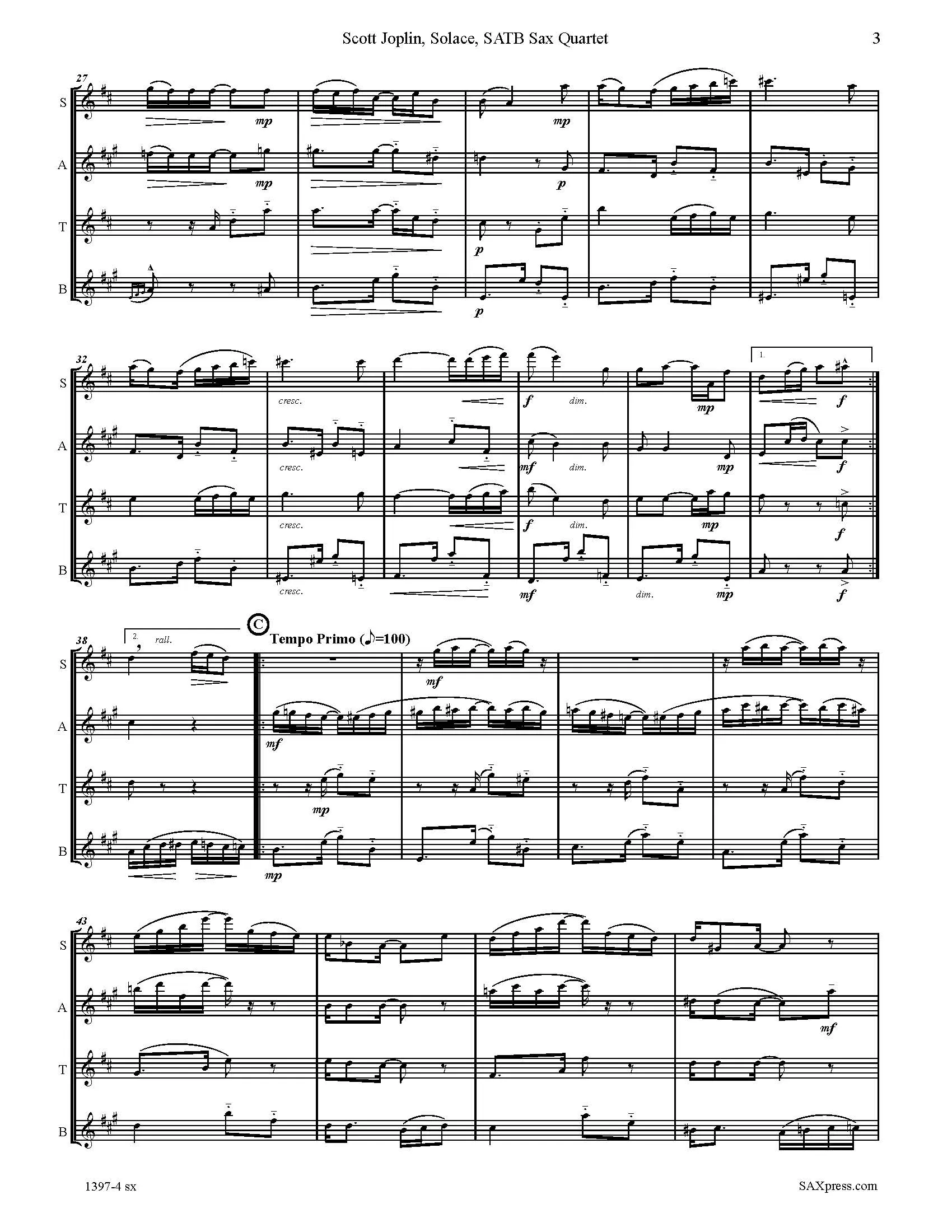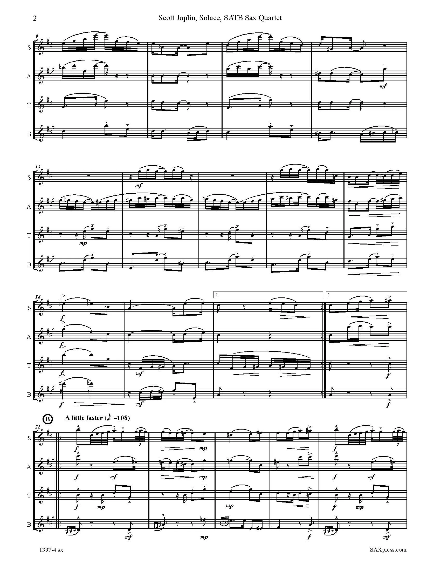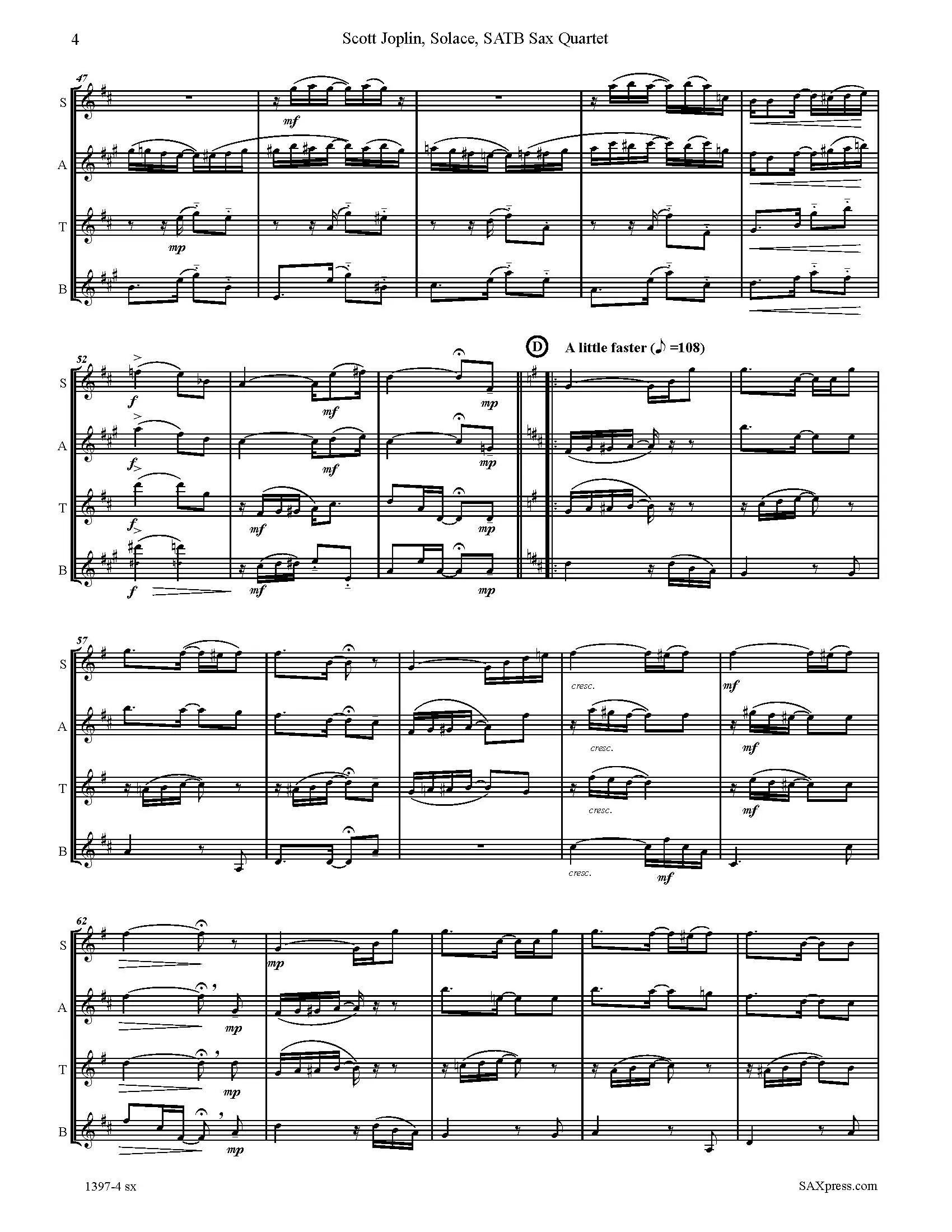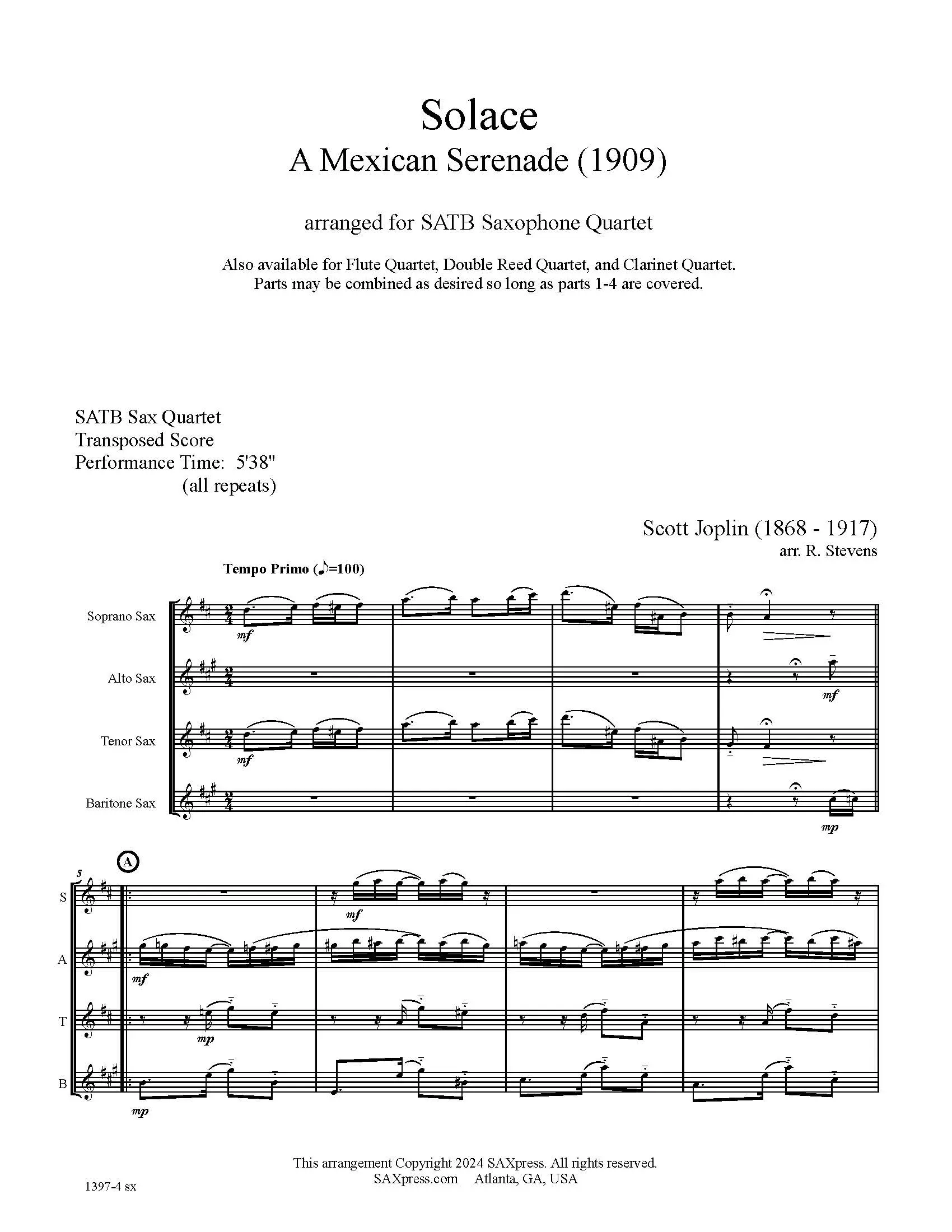 Solace – A Mexican Serenade – Saxophone Quartet. Music by Scott Joplin arranged for SATB Sax Quartet. Although Joplin sub-titled the work “A Mexican Serenade”, it has more in common with a tango or Cuban habanera. Whatever its origins, “Solace” is a beautiful ragtime serenade with a wistful, slightly melancholy feel to some of the melodies. “Solace” was one of Joplin’s compositions featured in the soundtrack of the 1973 film The Sting and helped to revive his music’s popularity.