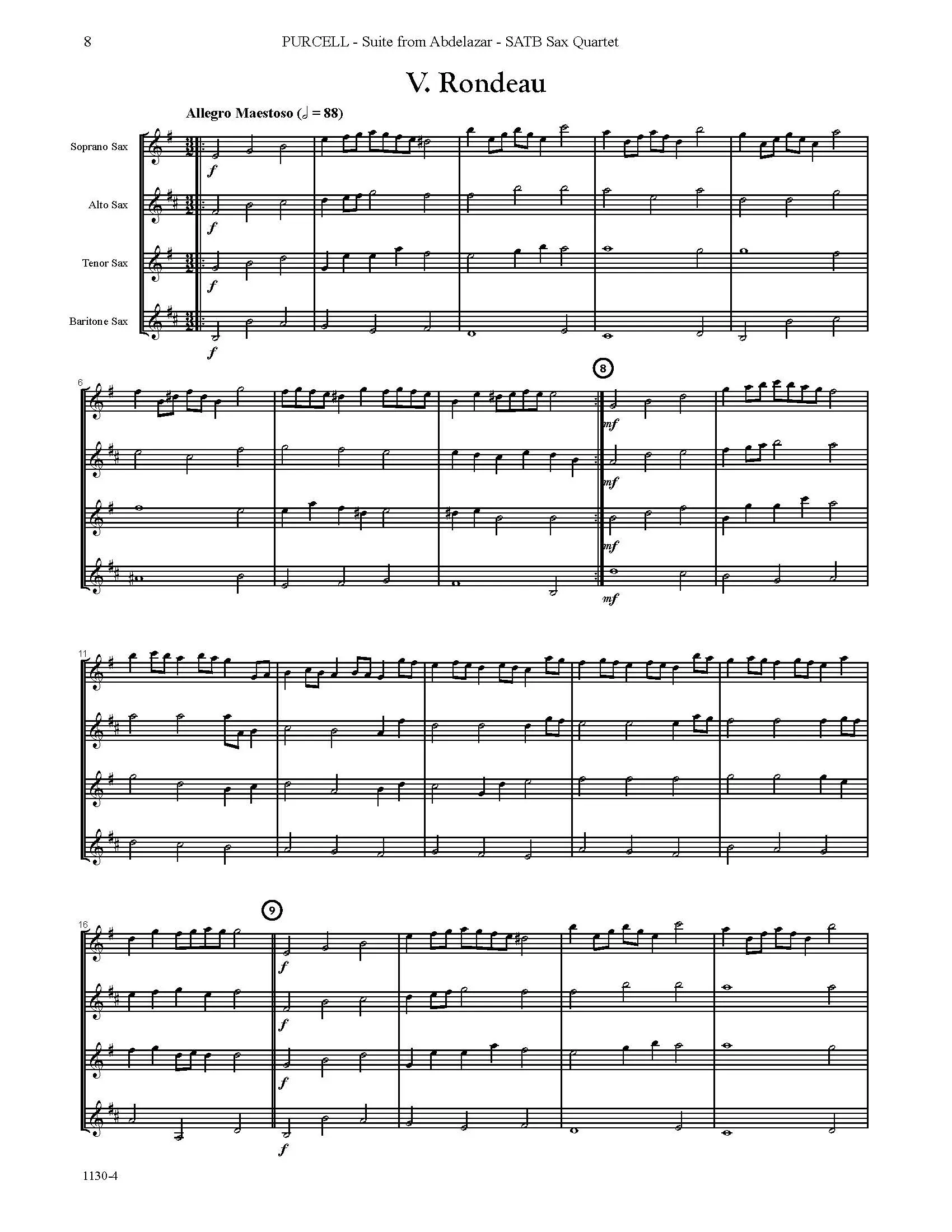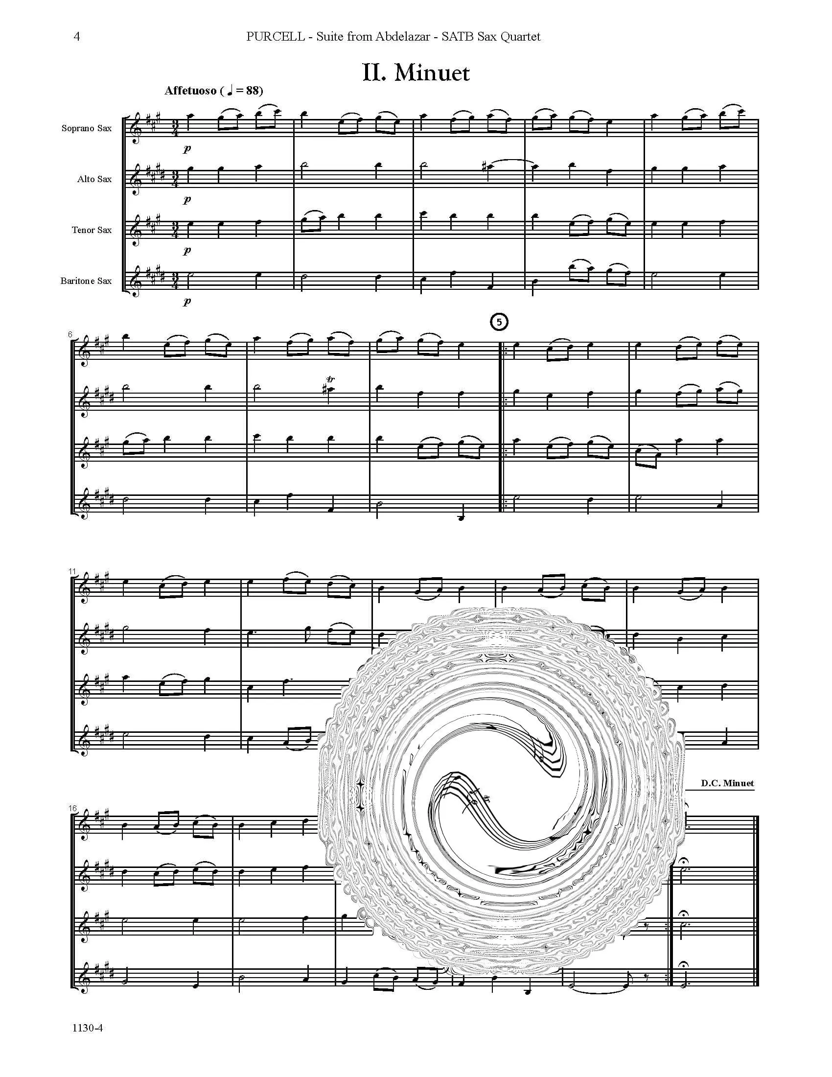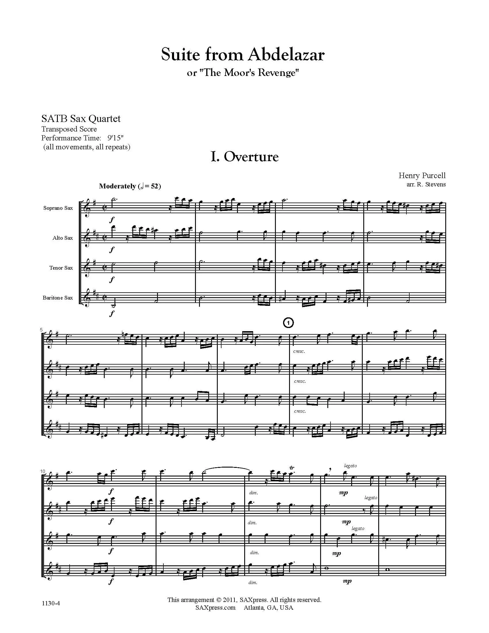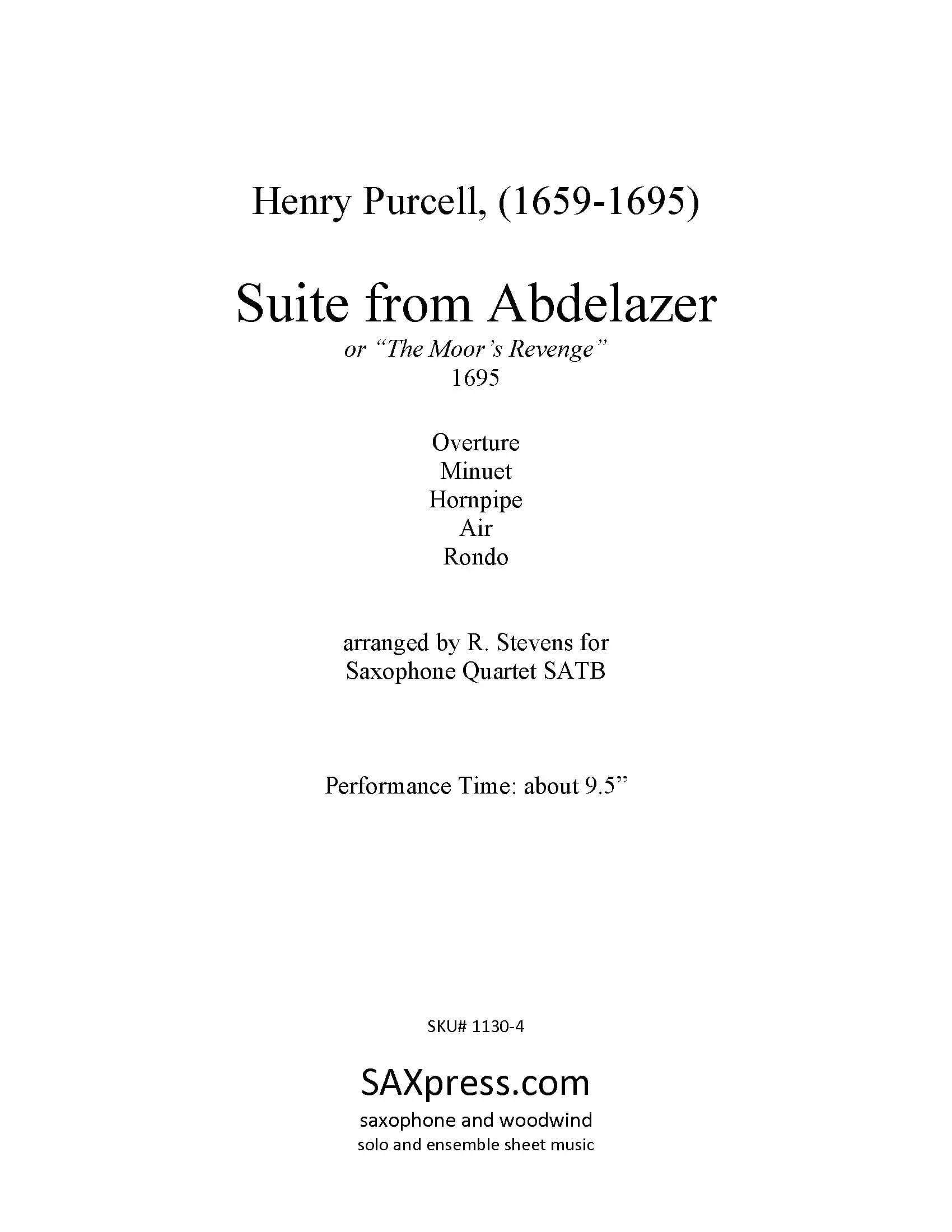 This transcription for saxophone quartet SATB of Suite from Abdelazer is comprised of five of the ten selections Purcell wrote for the play. The movements are as follows: