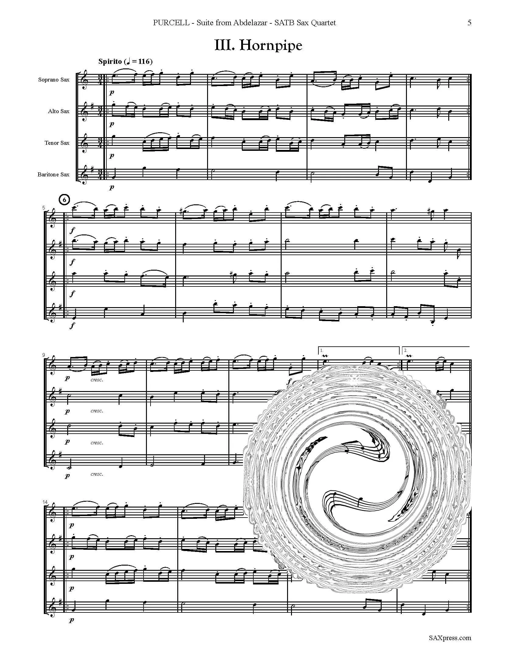Suite from Abdelazer by Henry Purcell, arranged for saxophone quartet SATB. Purcell wrote the incidental music for the play “Abdelazer” in 1695, shortly before his death. It is a lively mix of songs and dances of the time. Typical of the day, several of the movements became well known as popular songs. Today, the rondo is certainly one of the best known works by Purcell. It was later made famous by Benjamin Britten, who used it as the theme for his set of variations, ‘The Young Person’s Guide to the Orchestra’. The Rondo as well as another selection, the Hornpipe, was included in the 2005 film Pride and Prejudice.