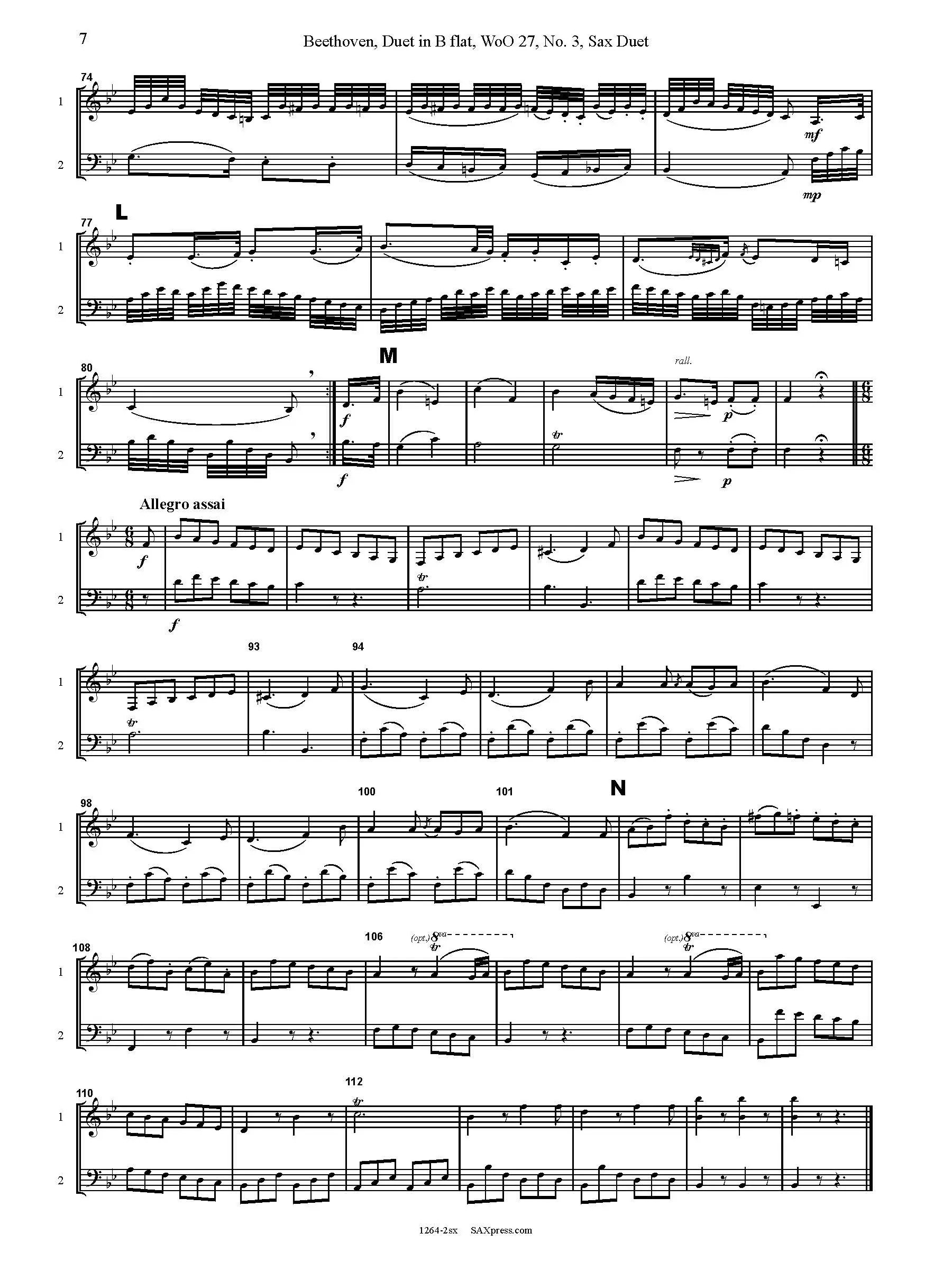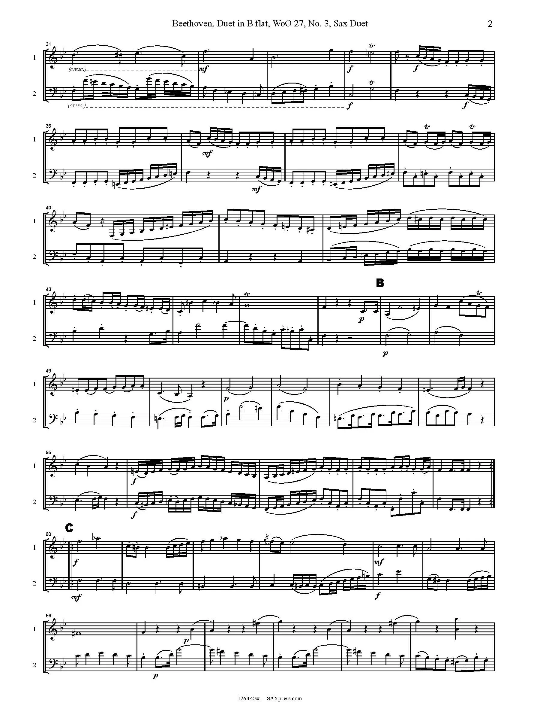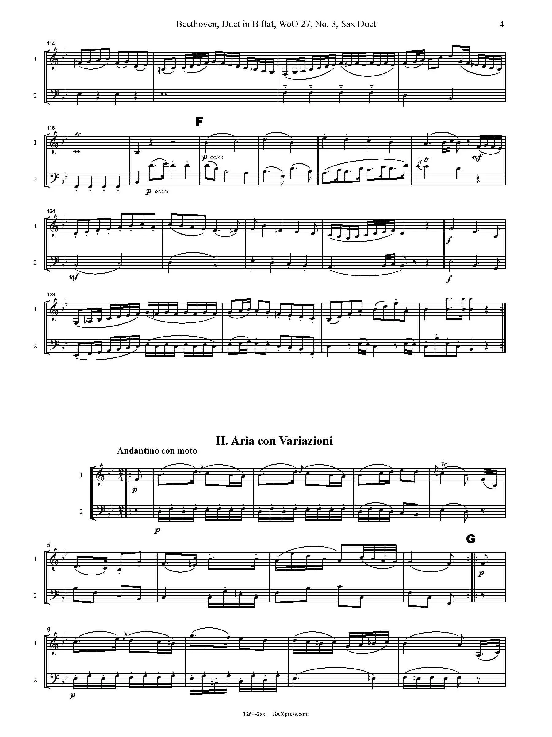 Duet in B flat, WoO. 27, No. 3 by Beethoven, arranged for any two saxophones. This is the third in a set of three duets originally written for clarinet and bassoon. The duet is in two movements: I. Allegro sostenuto, II. Aria con variazioni. The second movement, Aria with variations is the highlight of this duet. Each successive variation is livelier and the melody bounces back and forth from one part to another. It concludes with a brief and humorous Allegro assai. This arrangement is for any two saxophones: E flat and B flat 1st and 2nd parts are included as well as a duet score in c.