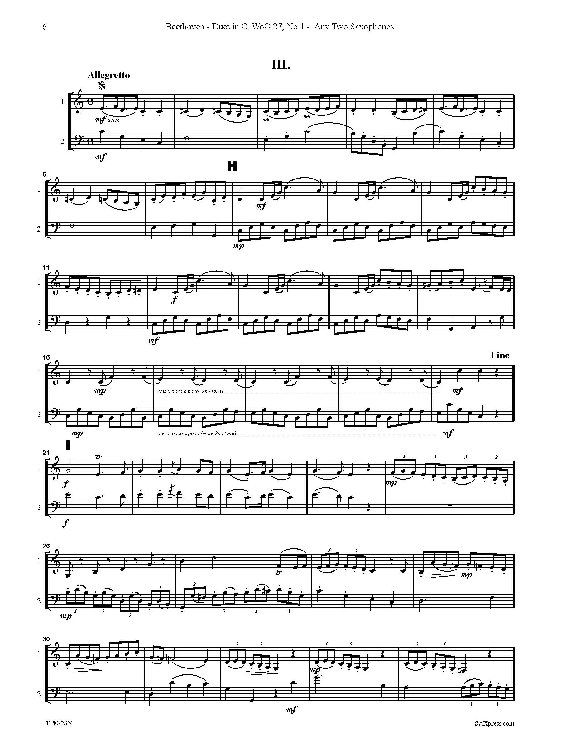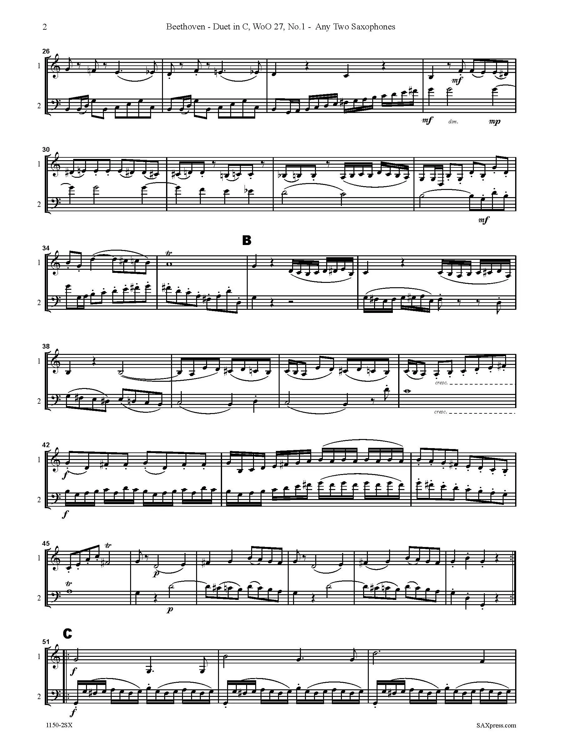 Duet in C, WoO. 27, No. 1 by Beethoven, arranged for any two saxophones is the first of a set of three duets originally written for clarinet and bassoon. The duet is in three movements: I. Allegro commodo, II. Larghetto sostenuto, III. Allegretto. E-flat and B-flat first and second parts, as well as a C score, are included.