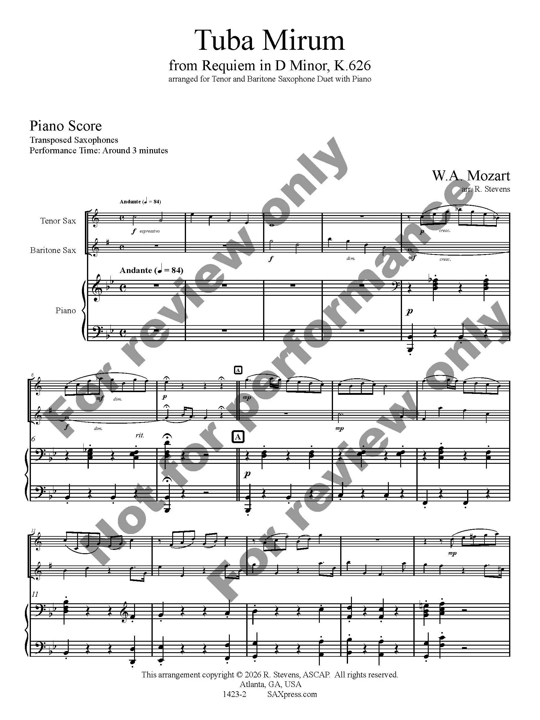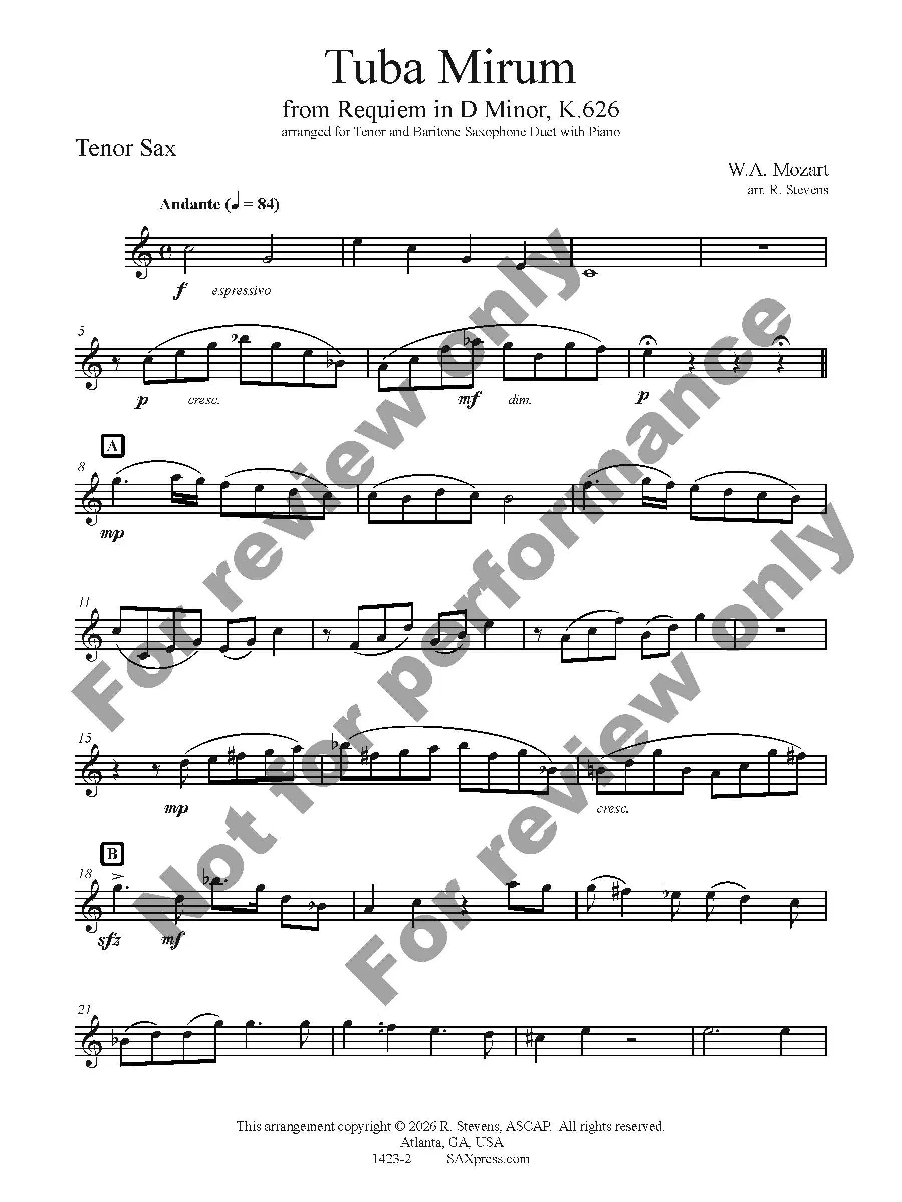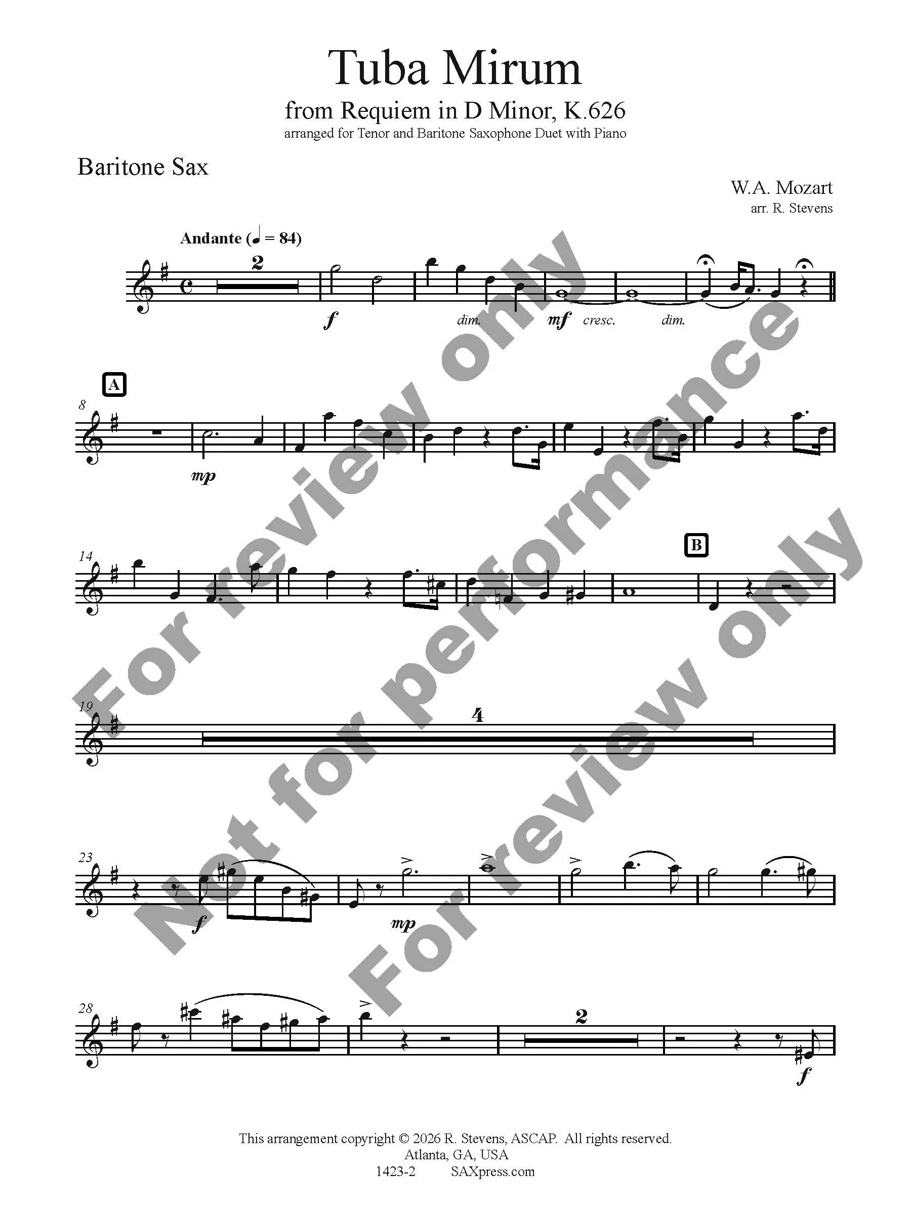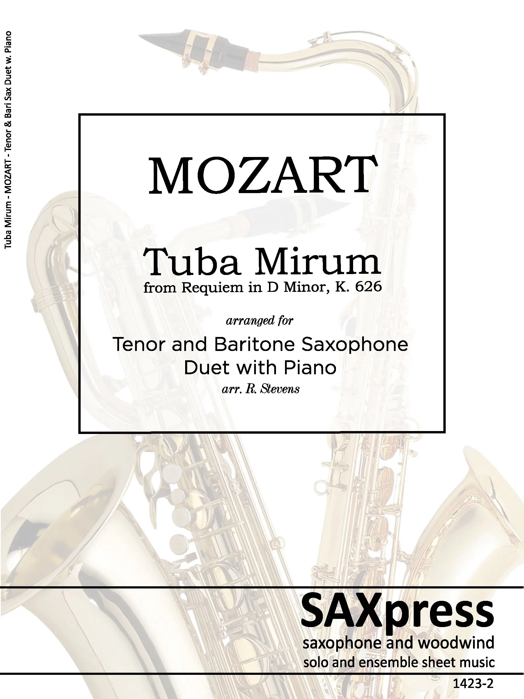 Tuba Mirum by W. A. Mozart arranged for Tenor Sax & Bari Sax Duet with Piano. Tuba Mirum is part of the Dies Irae of the Requiem mass. It opens with a very famous trombone solo, here transcribed for the tenor saxophone. When the bass voice enters (here played by the baritone saxophone) the solo becomes an obbligato.
