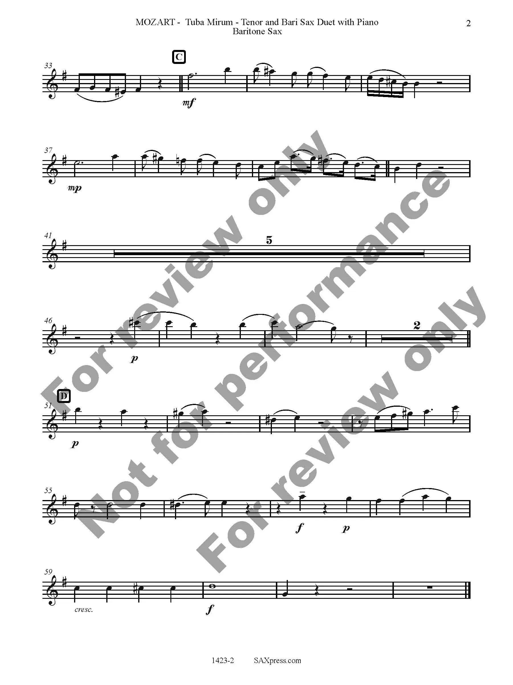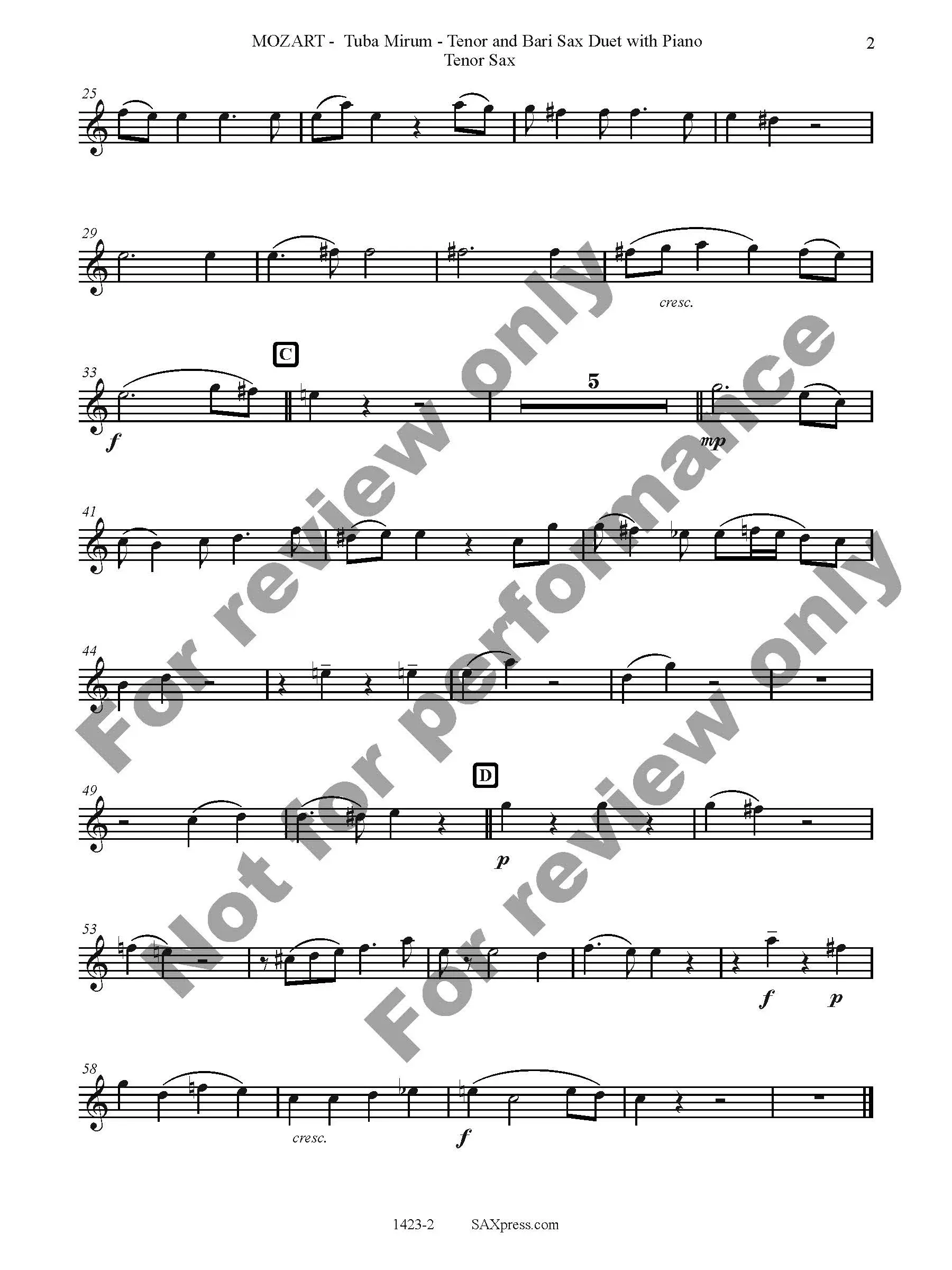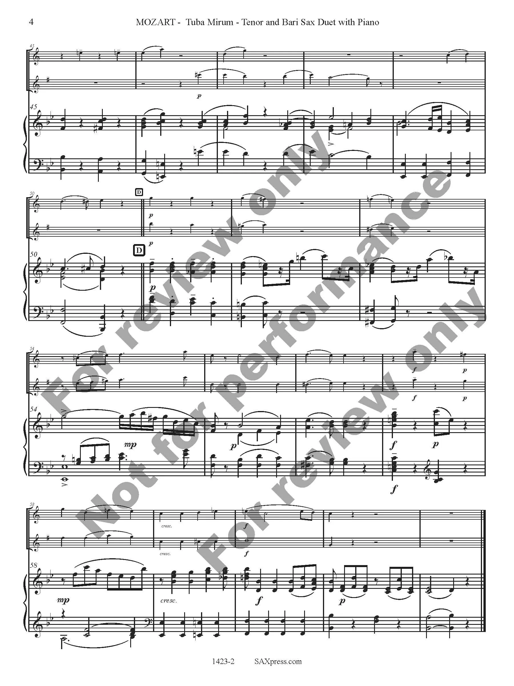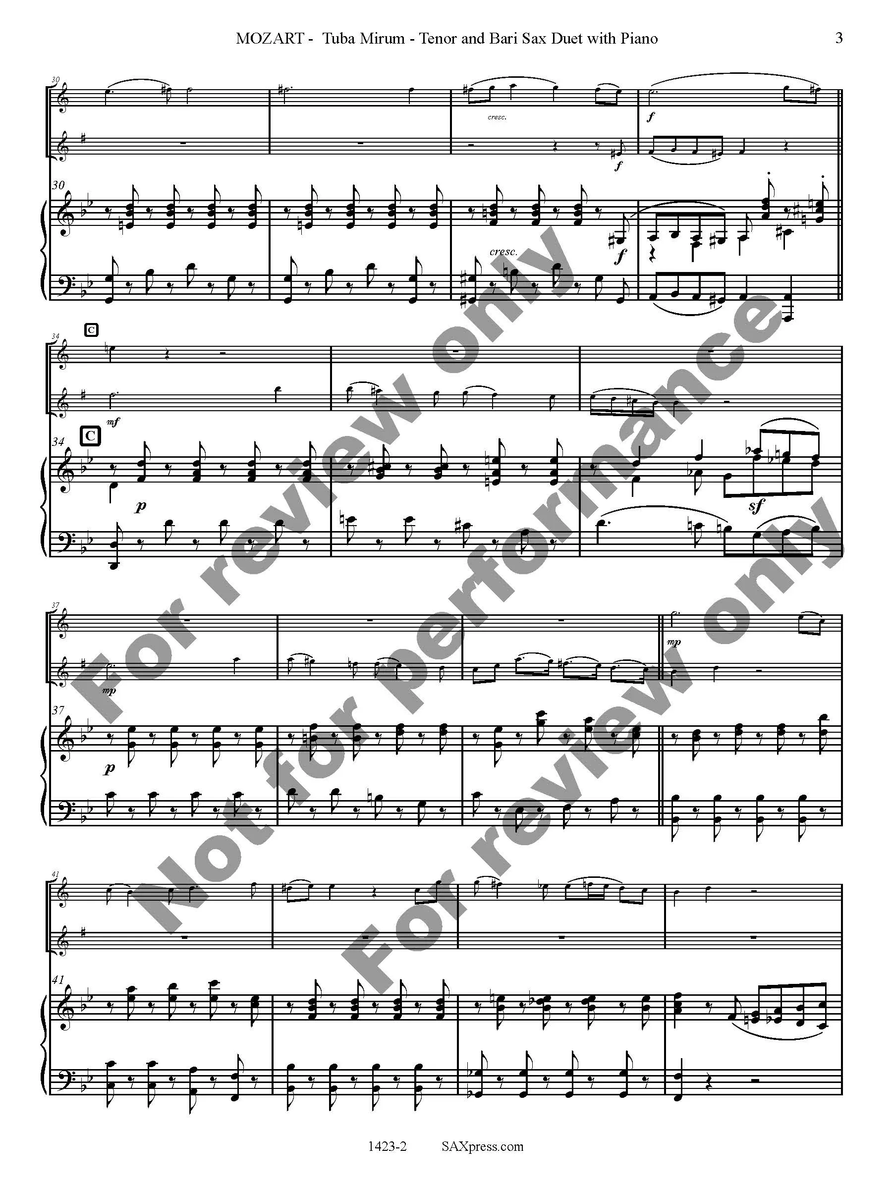Tuba Mirum by W. A. Mozart arranged for Tenor Sax & Bari Sax Duet with Piano. Tuba Mirum is part of the Dies Irae of the Requiem mass. It opens with a very famous trombone solo, here transcribed for the tenor saxophone. When the bass voice enters (here played by the baritone saxophone) the solo becomes an obbligato.