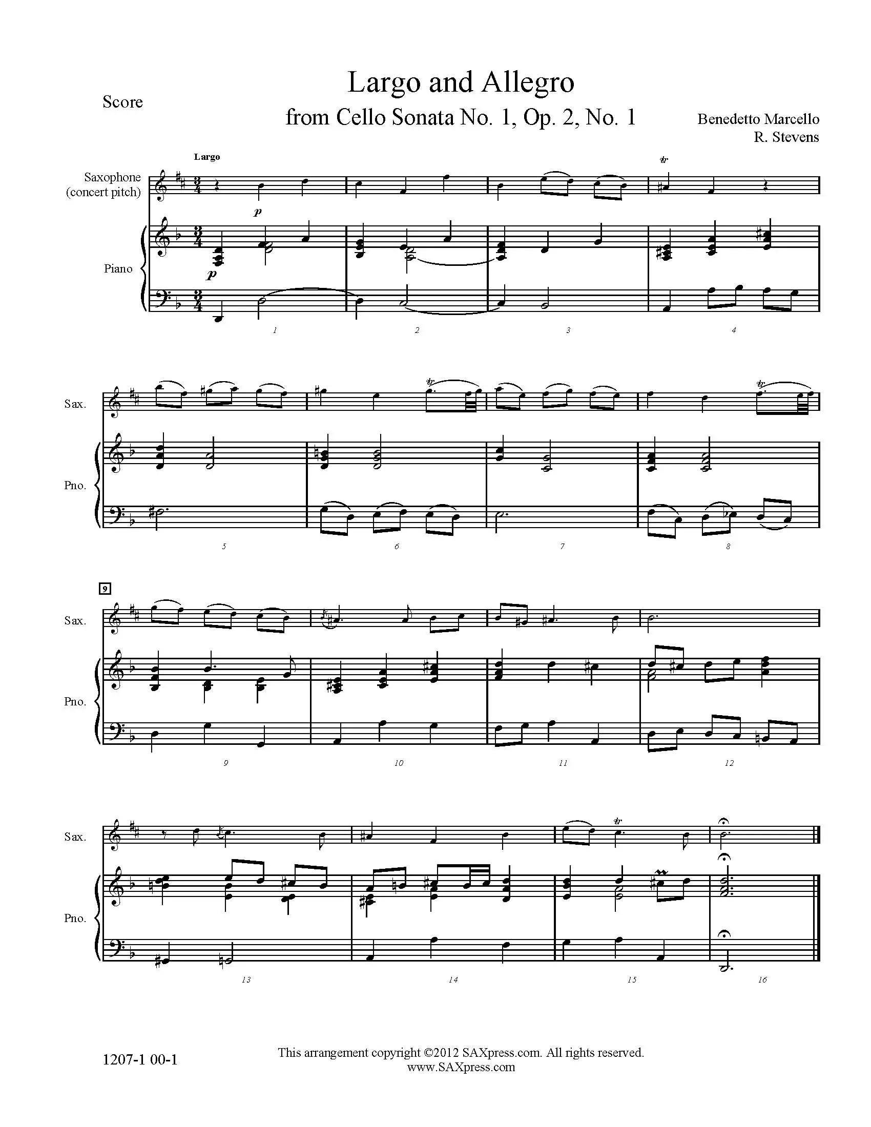 Largo and Allegro by Benedetto Marcello arranged for any saxophone solo with piano. These are the last two movements of Marcello’s Cello Sonata, Opus 2, No. 1, one of many solo instrumental works he wrote. The music is strongly influenced by Antonio Vivaldi.