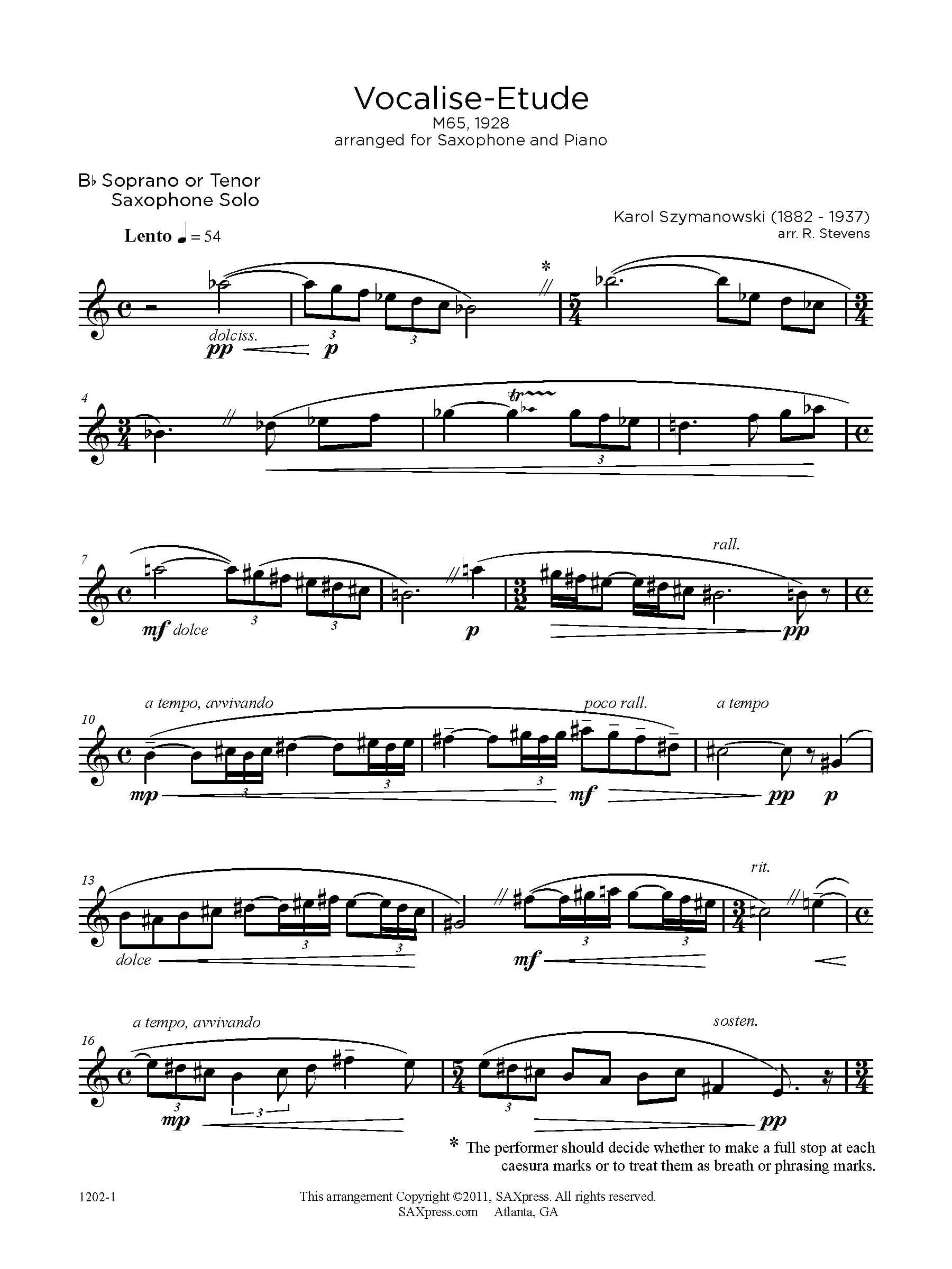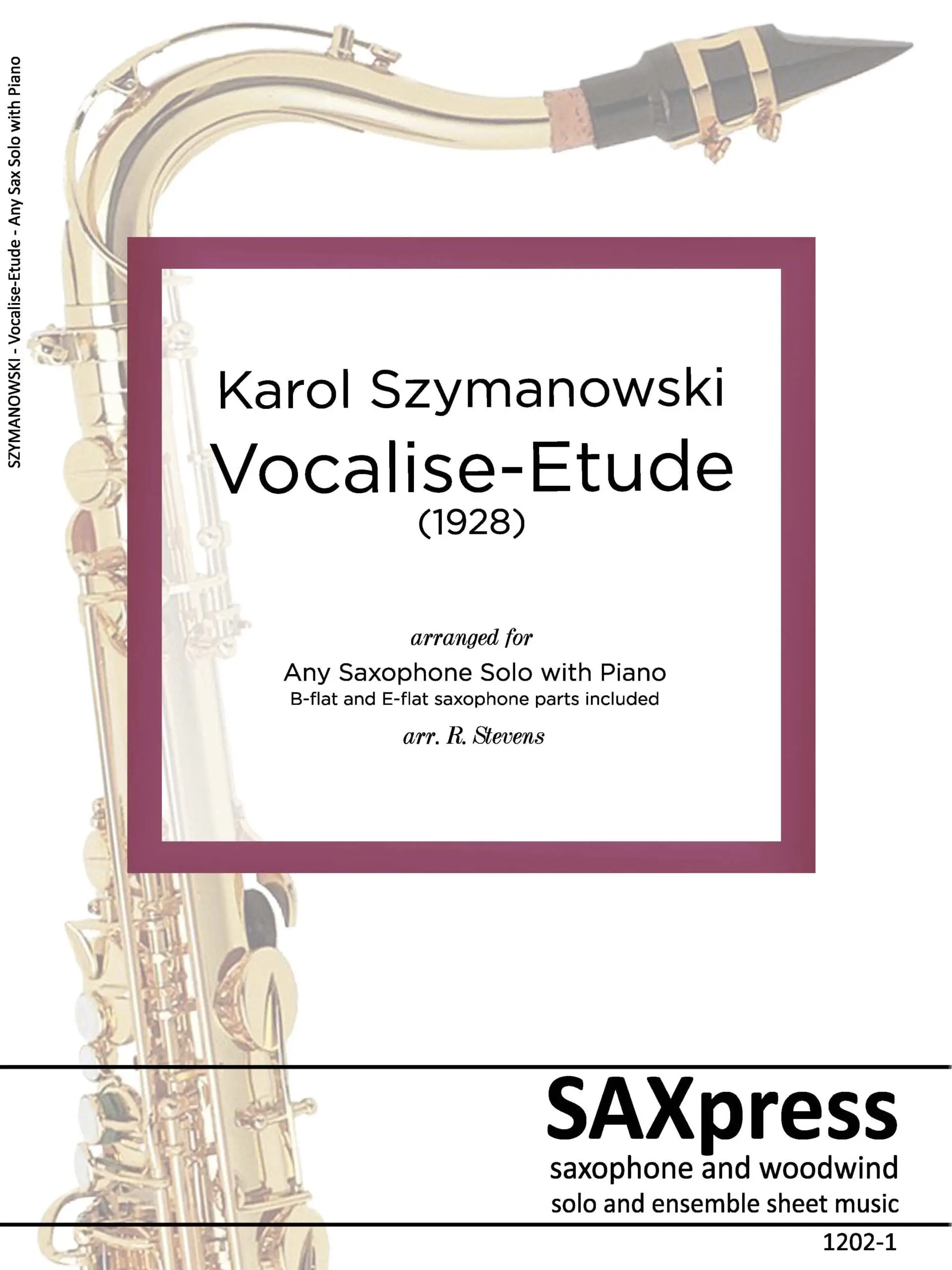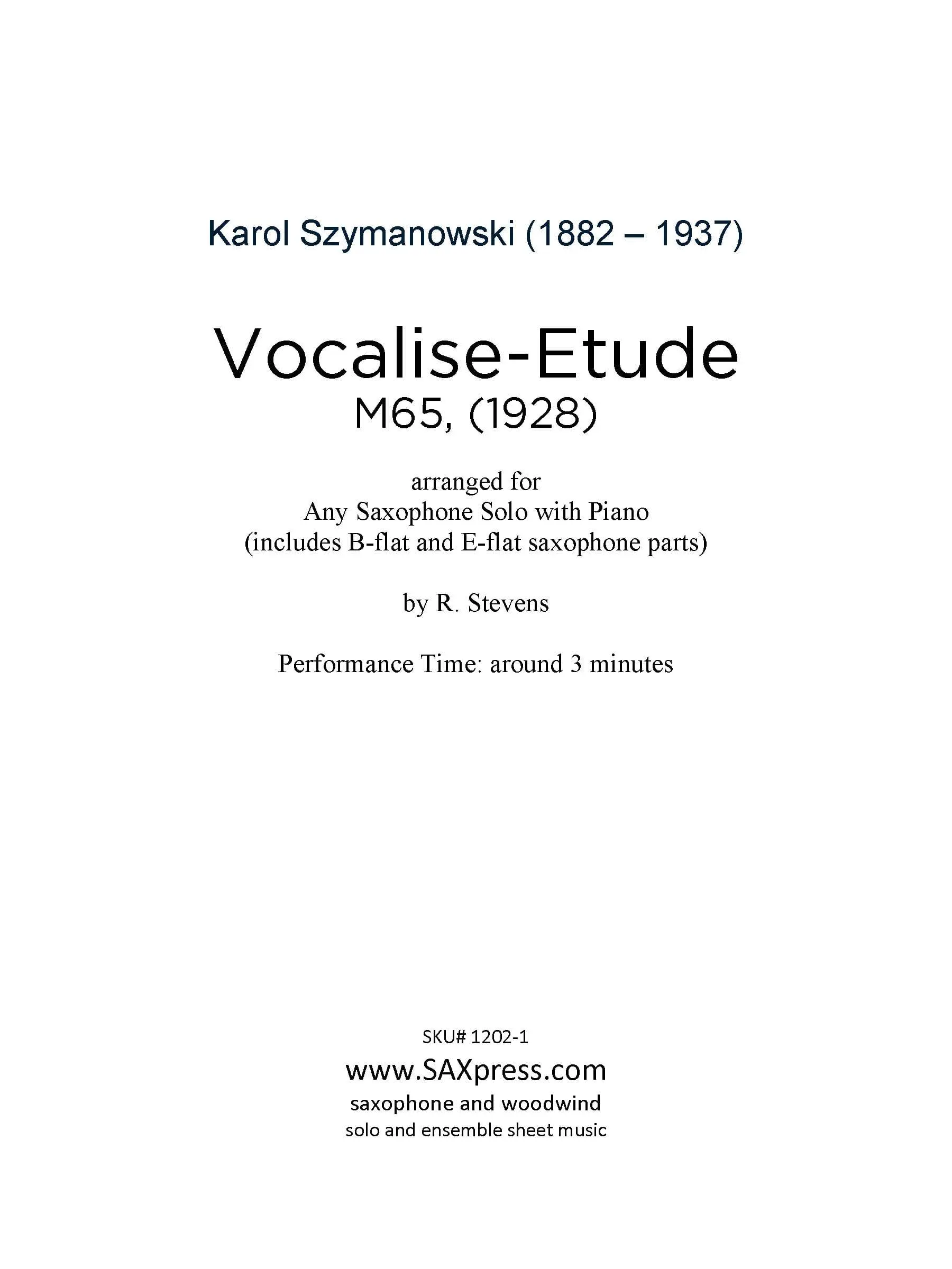 Vocalise Etude by Karol Szymanowski arranged for Any Saxophone with Piano. Szymanowski’s works can be roughly divided into three periods: the first is heavily influenced by Scriabin, Wagner, and other post-romantic composers; the second is an independent interpretation of atonality, and the third draws on Polish folk idioms. Although Vocalise Etude is a later work, it revisits the atonal style of his earlier music. If you don’t think an atonal piece can be beautifully melodic, you should give this a try.