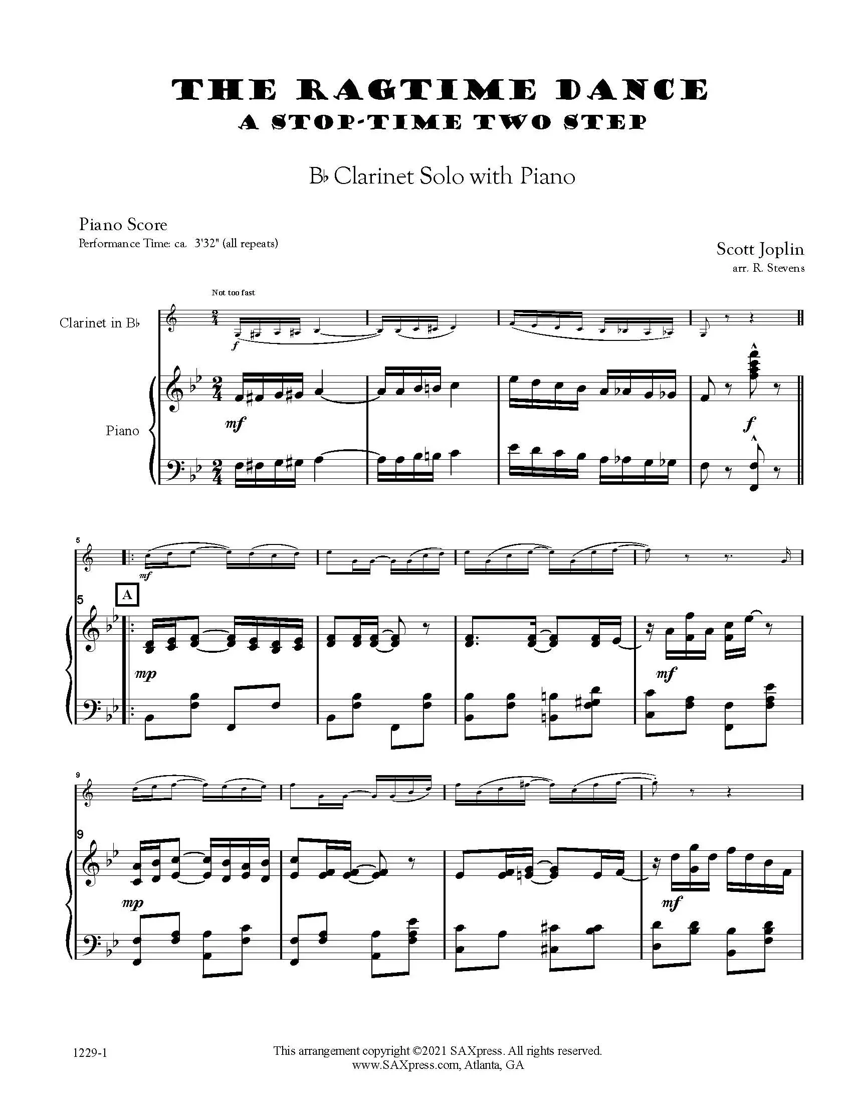 The Ragtime Dance B-flat clarinet solo with piano, by Scott Joplin. Joplin wrote two works with the title “The Ragtime Dance”. The first, written in 1899 and published in 1902, is something like a ballet with songs and a speaking part for narrator. It was a failure on stage and is now forgotten. The second and much better known work is a piano rag based on some of the tunes in the stage show. This little piano rag is one of the genre’s most loved pieces and has been transcribed for many different ensembles. It has been used in many films, most notably in the 1973 movie “The Sting”.