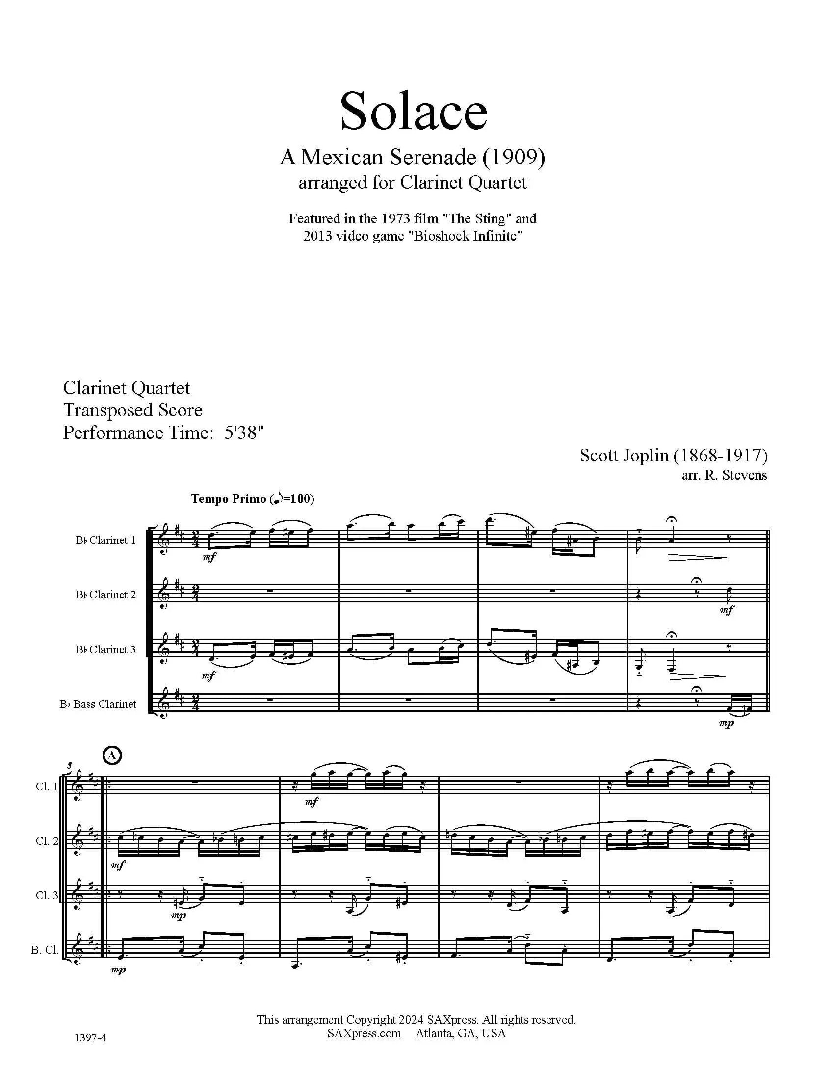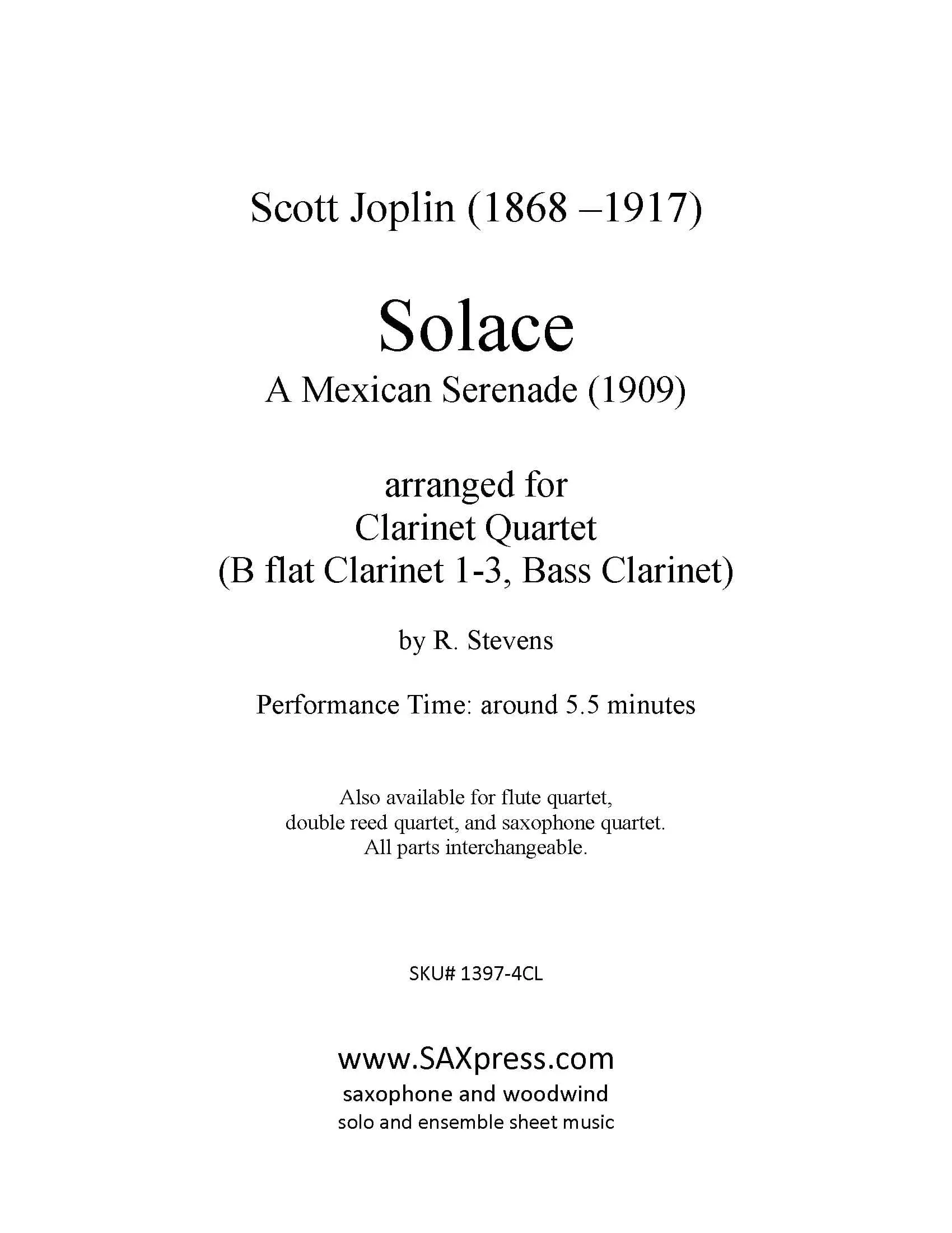 Solace – A Mexican Serenade - Clarinet Quartet. Music by Scott Joplin arranged for Clarinet Quartet.