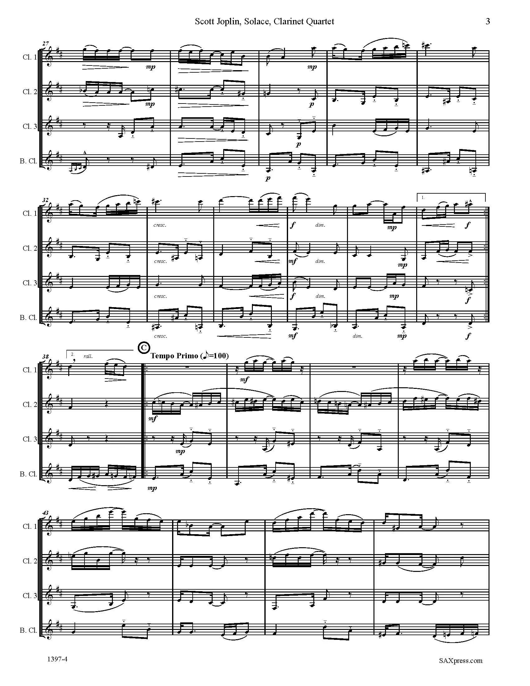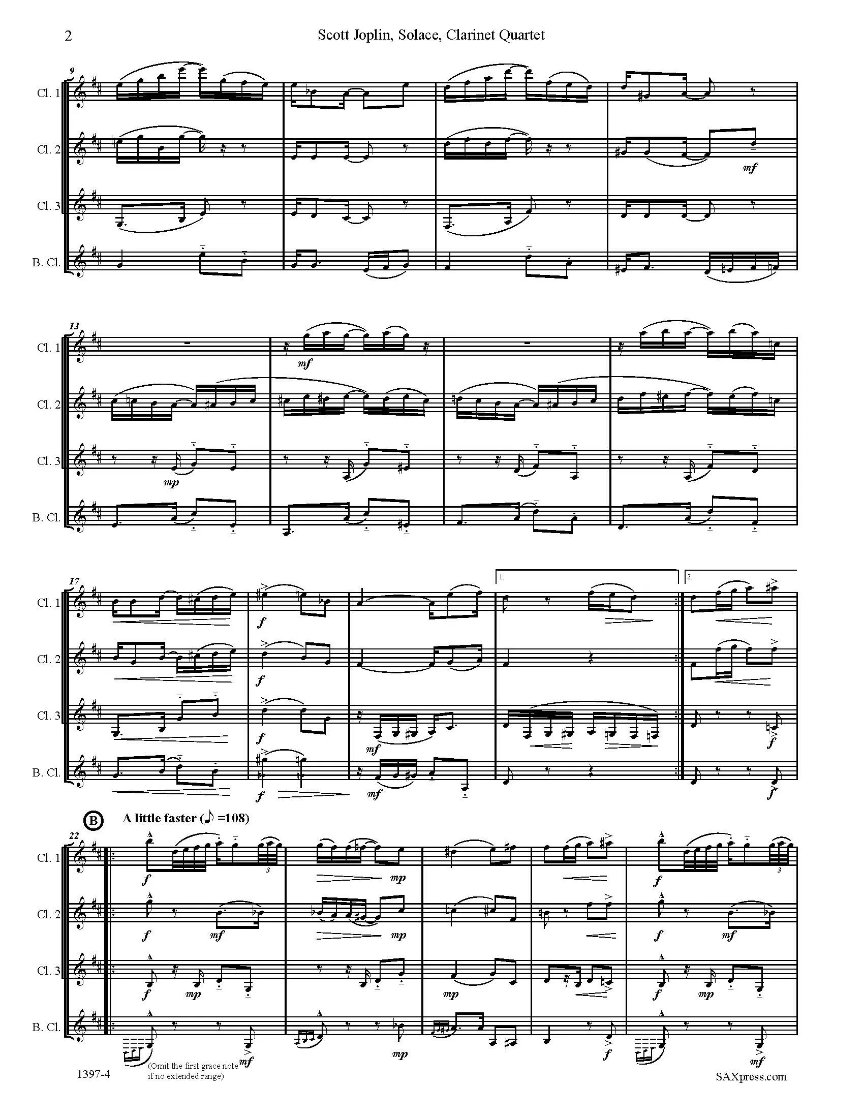 Solace – A Mexican Serenade – Clarinet Quartet. Music by Scott Joplin arranged for Clarinet Quartet (B flat Cl. 1-3, Bass Clarinet). Although Joplin sub-titled the work “A Mexican Serenade”, it has more in common with a tango or Cuban habanera. Whatever its origins, “Solace” is a beautiful ragtime serenade with a wistful, slightly melancholy feel to some of the melodies. “Solace” was one of Joplin’s compositions featured in the soundtrack of the 1973 film The Sting and helped to revive his music’s popularity.
