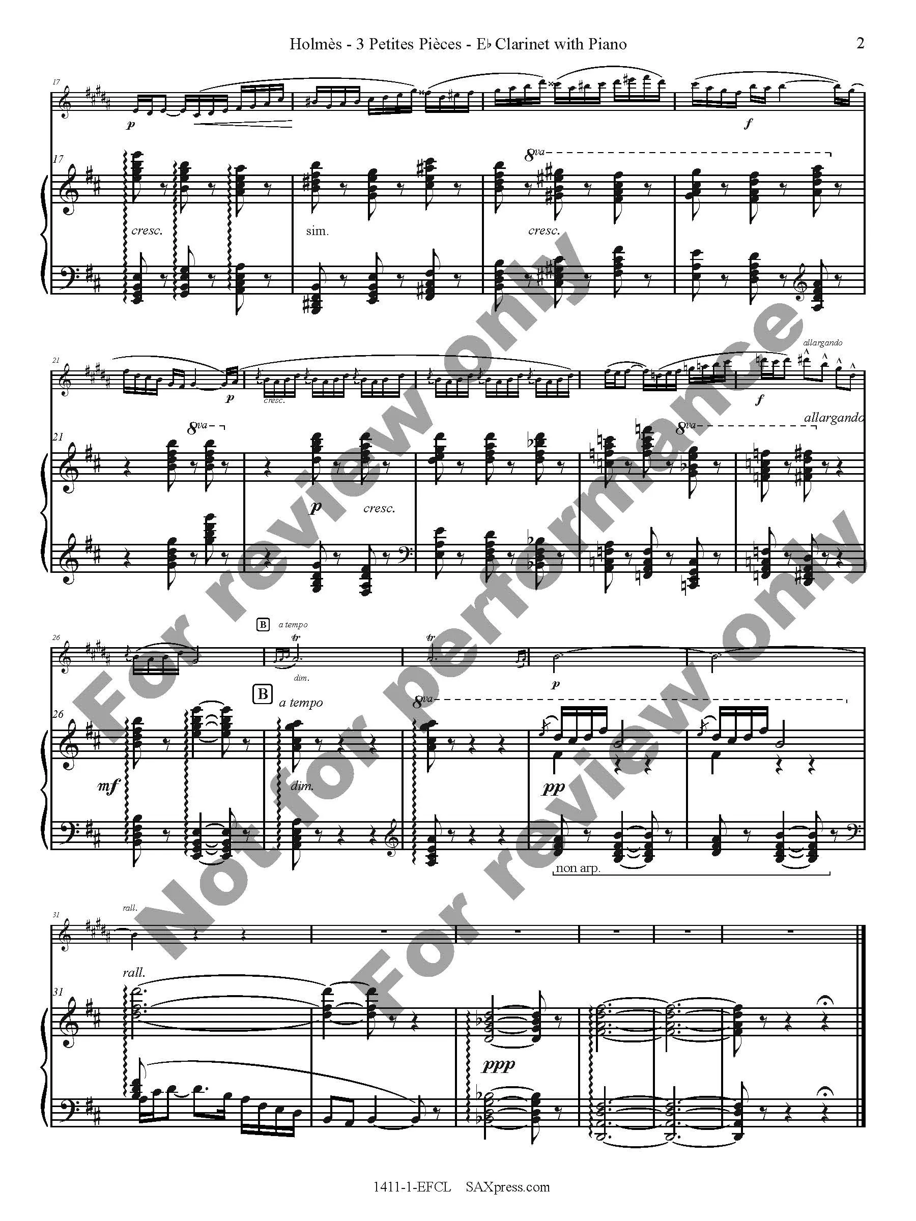 E flat Clarinet is for E flat Clarinet solo with Piano. The original key of all three movements has been retained. The first movement is in the key of D major, putting the clarinet part in B major; however, the piece is a little slow and it lays under the fingers well. Taken as a whole, the set of pieces is of moderate difficulty. Thanks to clear rhythms and well-written piano support, intermediate players should find success with this set.