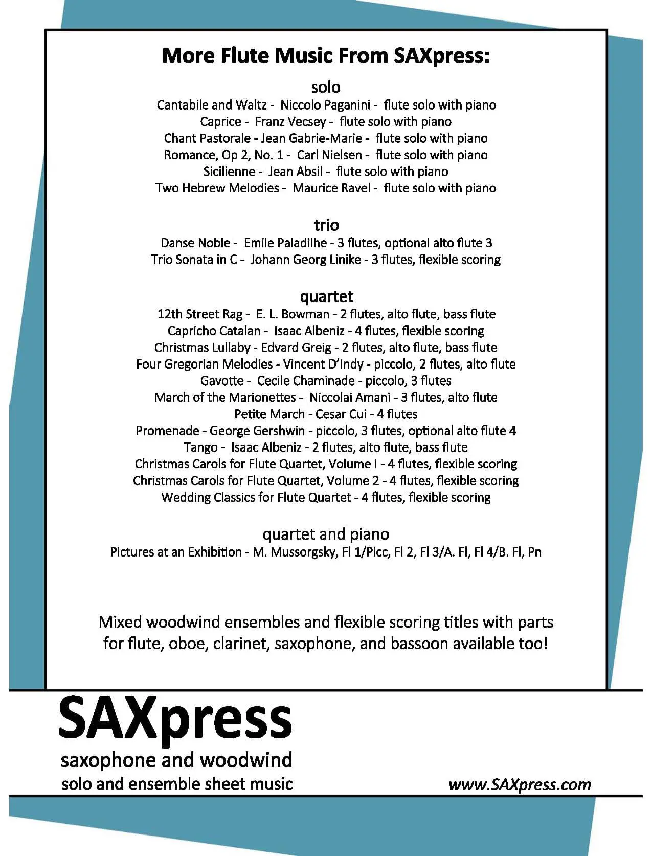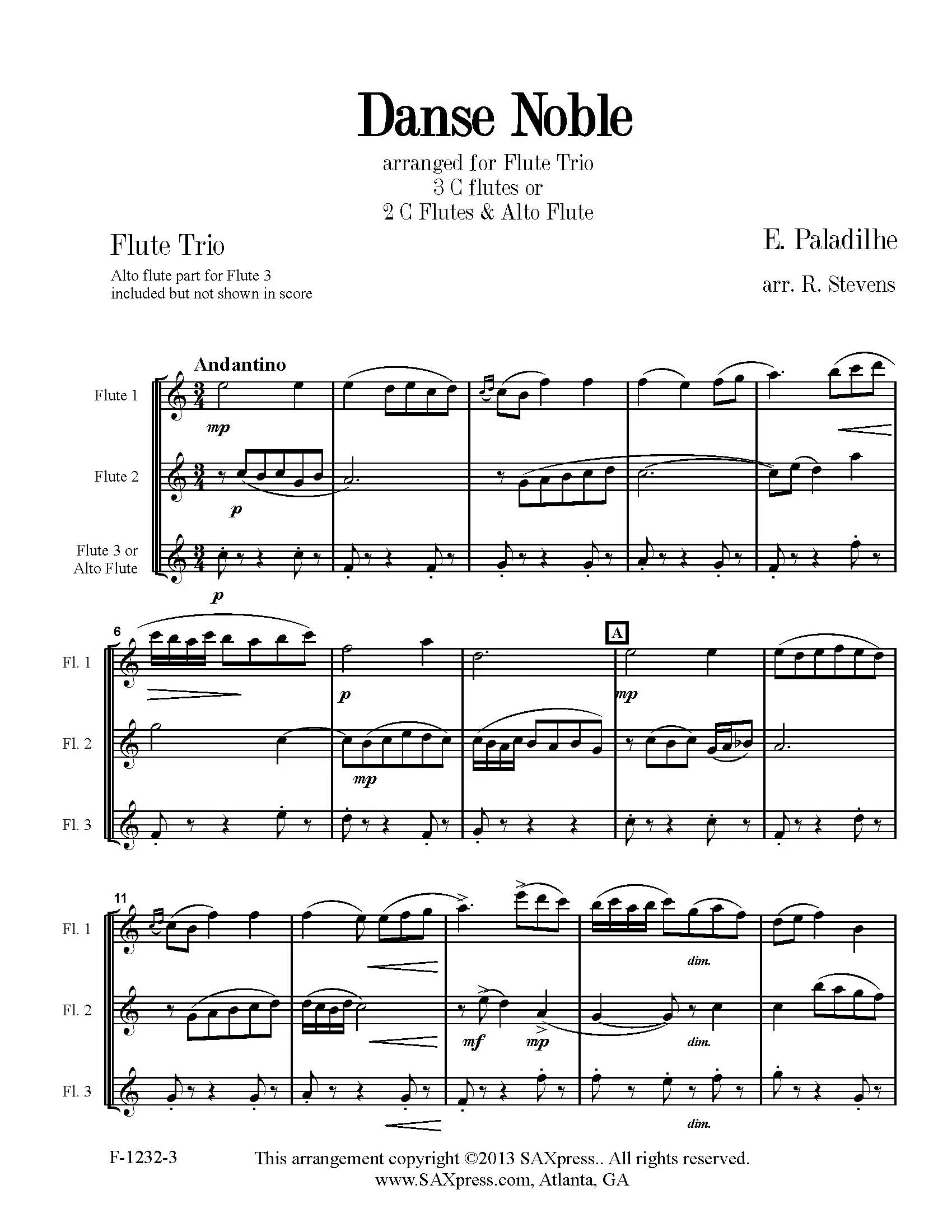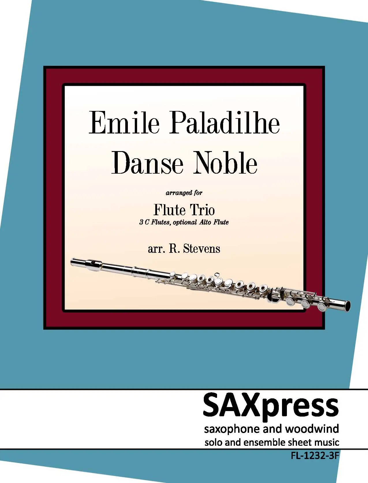 Danse Noble flute trio by Paladilhe, arranged for 3 C flutes or 2 C flutes & alto flute. This trio is an elegant little dance that began life as a work for piano. This setting is for flute trio, either three C flutes or 2 C flutes and alto flute. Flutes 1 and 2 trade melody and counter melody statements while the third flute/alto flute provides a quiet bass line. The arrangement for flute trio is raised one half step from the original key of A major to B flat major.