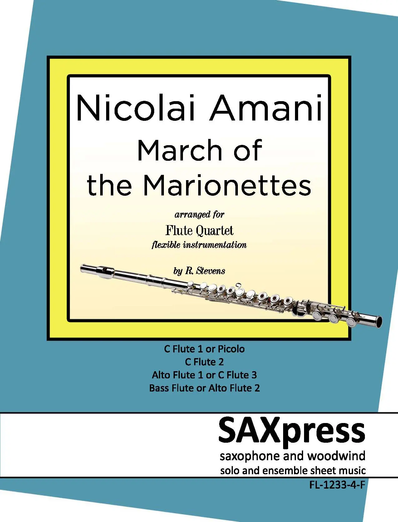 March of the Marionettes, by Nicolai Amani, arranged for flute quartet with flexible scoring. March of the Marionettes is a lively march from Amani’s Album for the Young, a set of 12 pieces for piano. The melody passes between all the voices and the middle section features the lower voices, alto flute and bass flute.